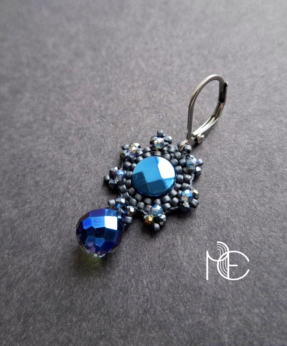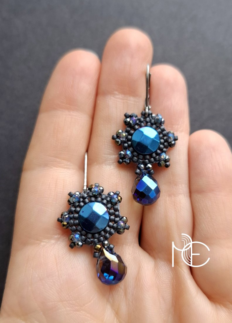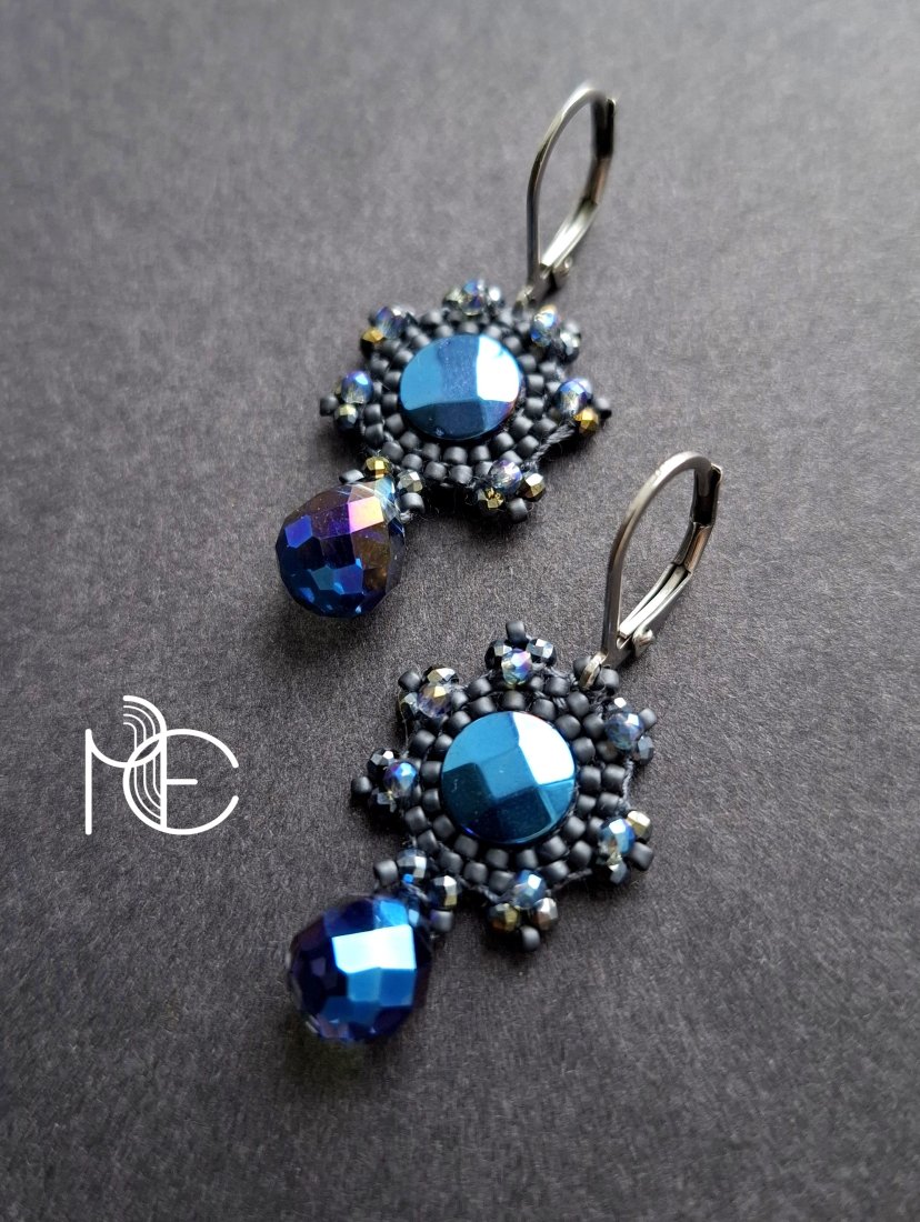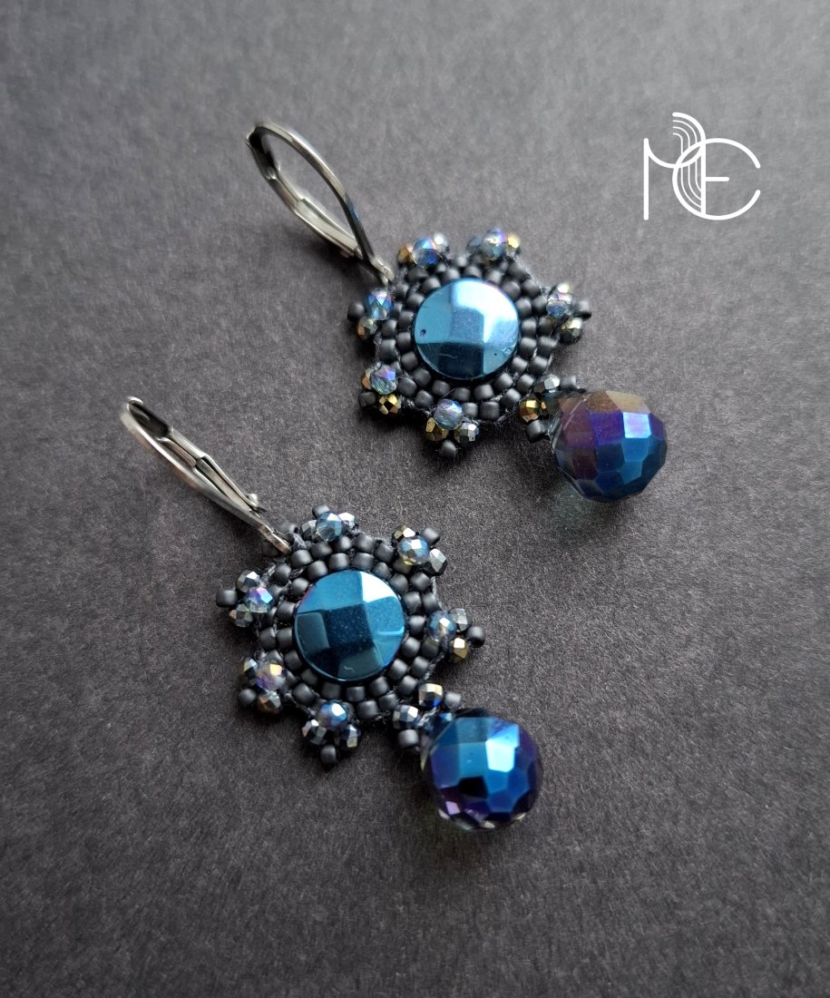 Drobne kolczyki wiszące wykonane techniką swoistego haftu drobnymi, szklanymi koralikami w połączeniu z hematytami platerowanymi oraz kryształowymi kroplami. Dwustronne, podwieszone na posrebrzanych i nieuczulających biglach. Wymiary: długość wraz z zapięciem - 4 cm, szerokość max. 1,8 cm. Wykonane w jedynym egzemplarzu.