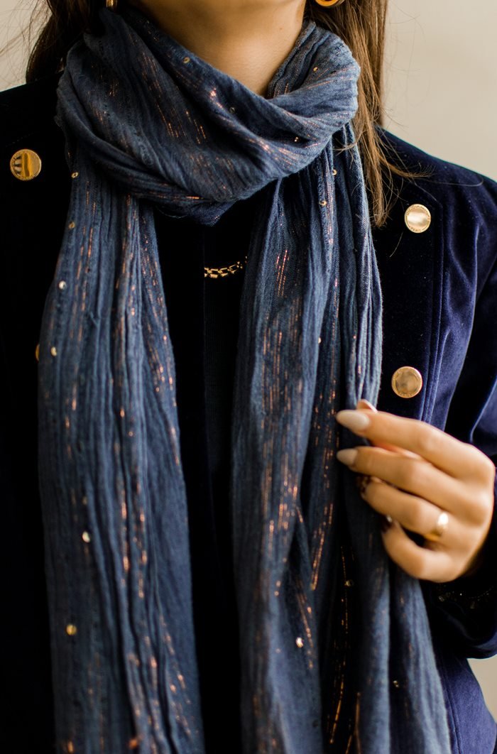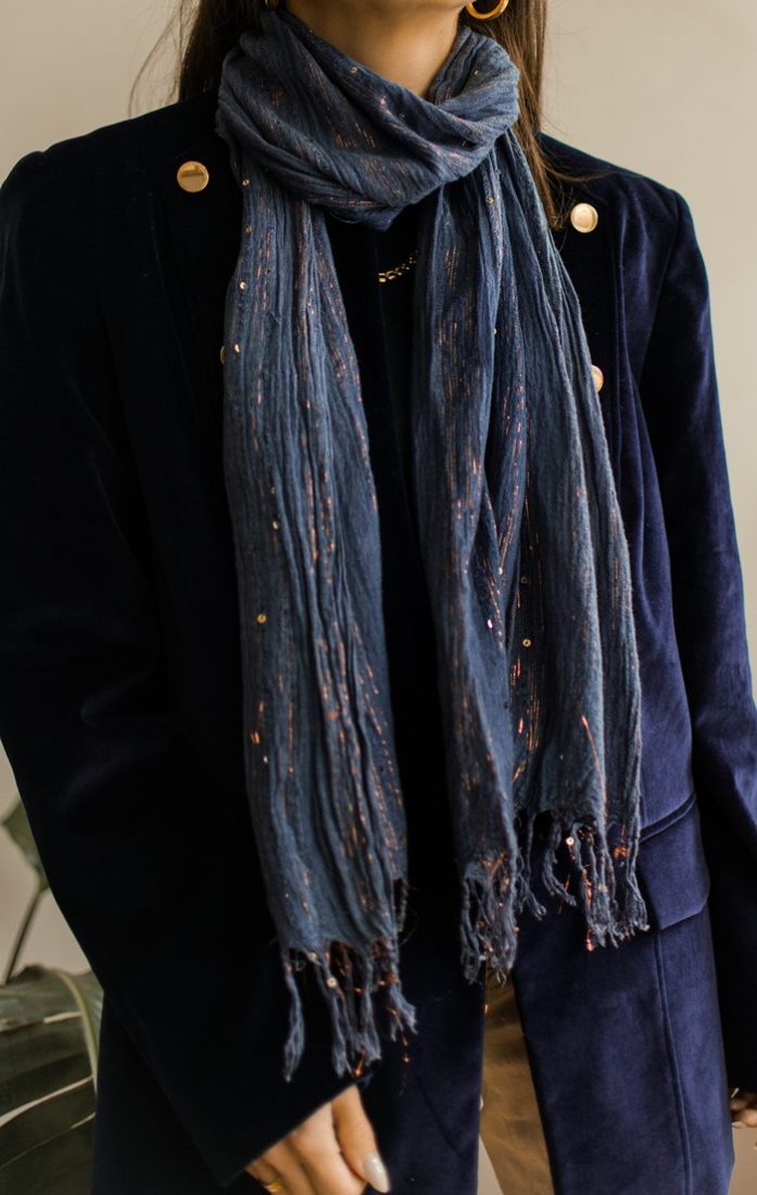 Błyszcząca chustka z drobnymi cekinami.