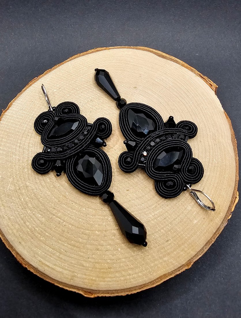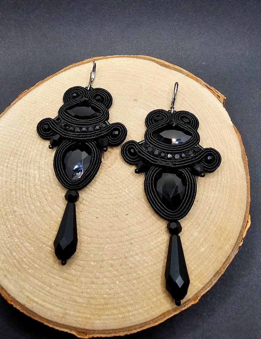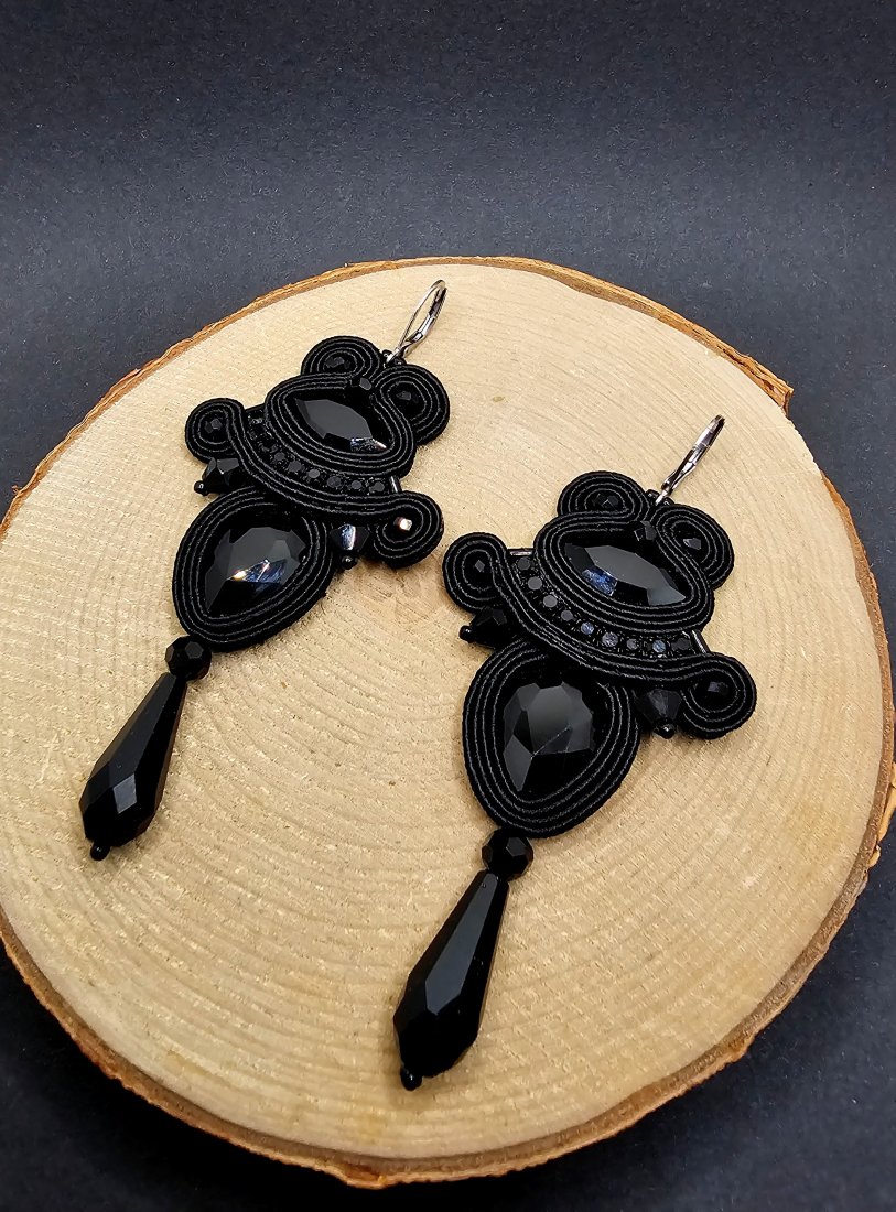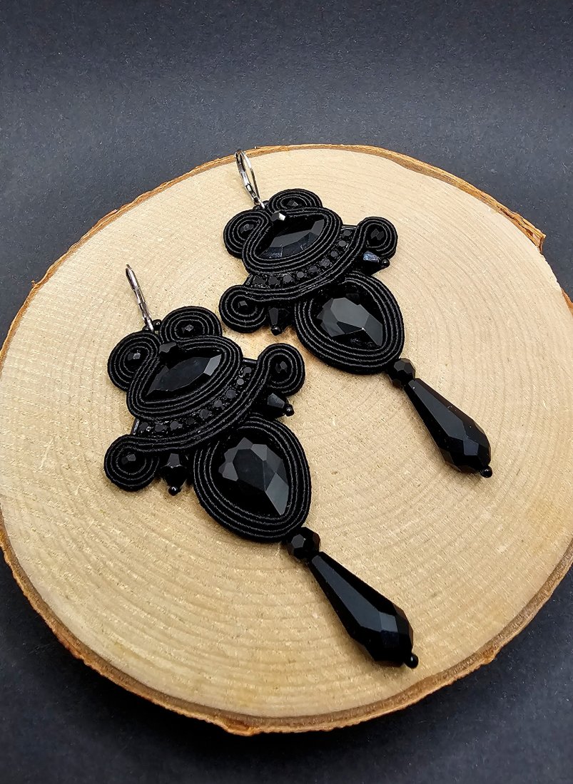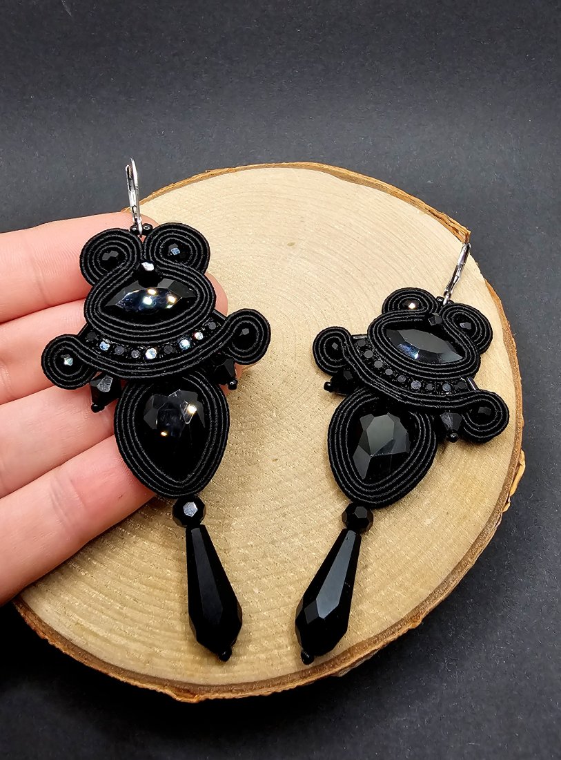 Duże, zjawiskowe kolczyki sutasz idealne sprawdzą się jako biżuteria wieczorowa lub na przyjęcie. Stonowana kolorystyka, klasyczna czerń przełamana błyszczącymi elementami dopasuje się do wielu stylizacji. Pomimo swoich rozmiarów kolczyki dość lekkie, bardzo wygodne w noszeniu.