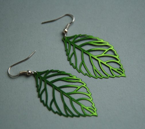 Wykonane z cienkiego metalu w zielonym odcieniu, z błyszczącą powłoką (na zdjęciu widoczna jako jaśniejsza część kolczyków). Listki przymocowane są do bigla tak, że są najlepiej widoczne, kiedy patrzymy na twarz z profilu (na życzenie mogę zamocować na tradycyjnych biglach).