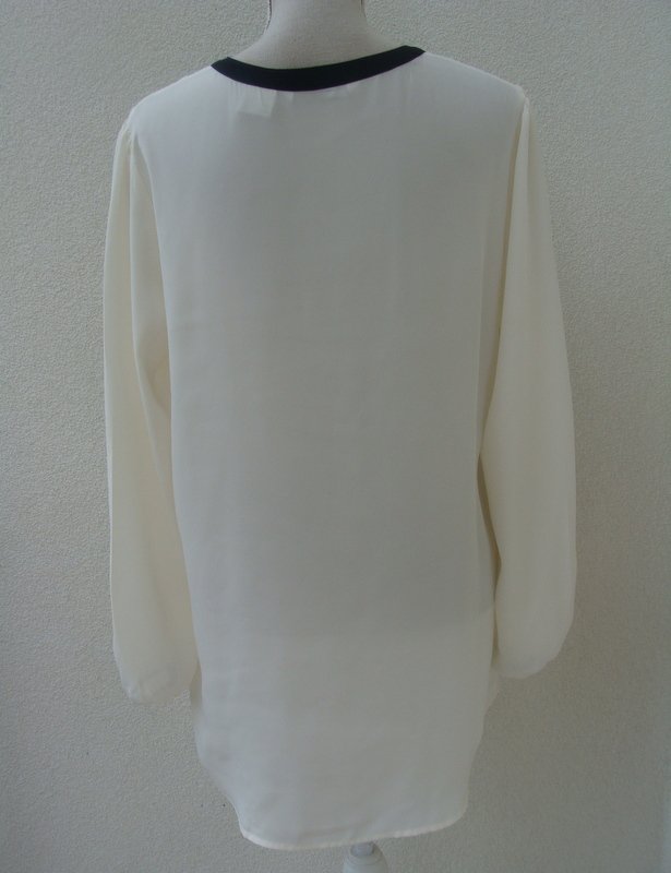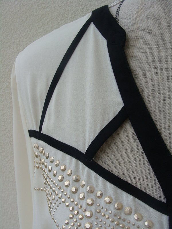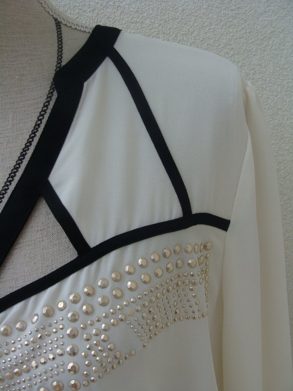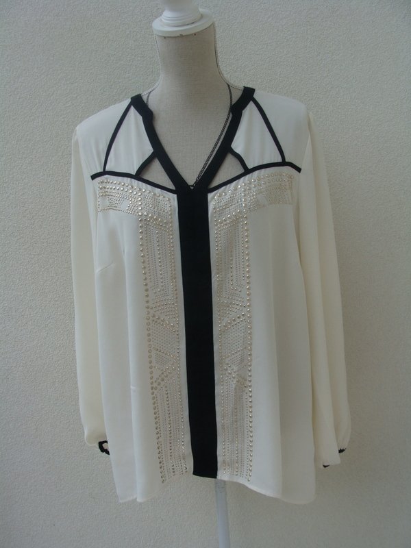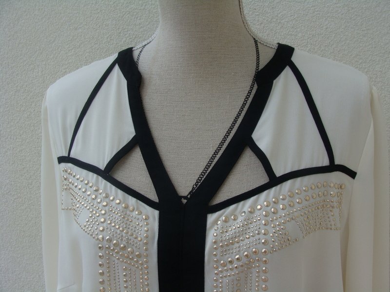 Piękna bluzka z poliestrowej tkaniny w kolorze ecru z czarnymi dodatkami wykończeniowymi, zdobiona subtelnymi ćwiekami w złotym kolorze z ażurowym wycięciem przy dekolcie. Luźny fason. Asymetryczna - tył nieco dłuższy od przodu