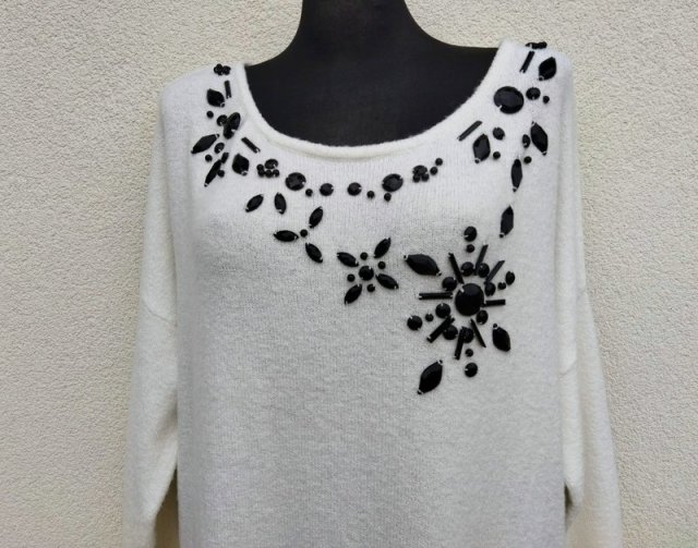 Miła, mięciutka dzianinowa sukienka w białym kolorze z biżuteryjnymi zdobieniami w czarnym kolorze. minimalistyczny krój z owalnym dekoltem. Wykończona ściągaczami. Podatna i rozciągliwa.