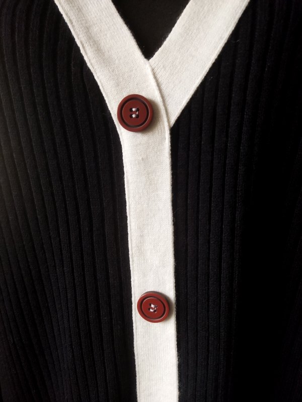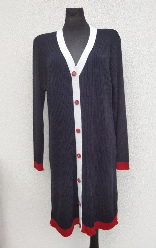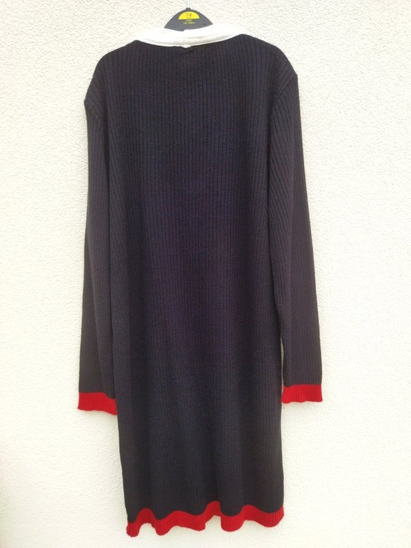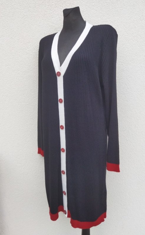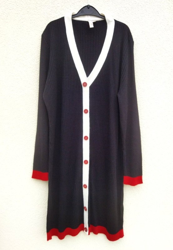 Dobrej jakości dzianinowa sukienka w czarnym kolorze z biało-czerwonymi elementami wykończeniowymi. Dekolt w szpic , na białej plisie naszywane czerwone guziki imitujące zapięcie. Miła, podatna i bardzo wygodna. W realu ładniejsza