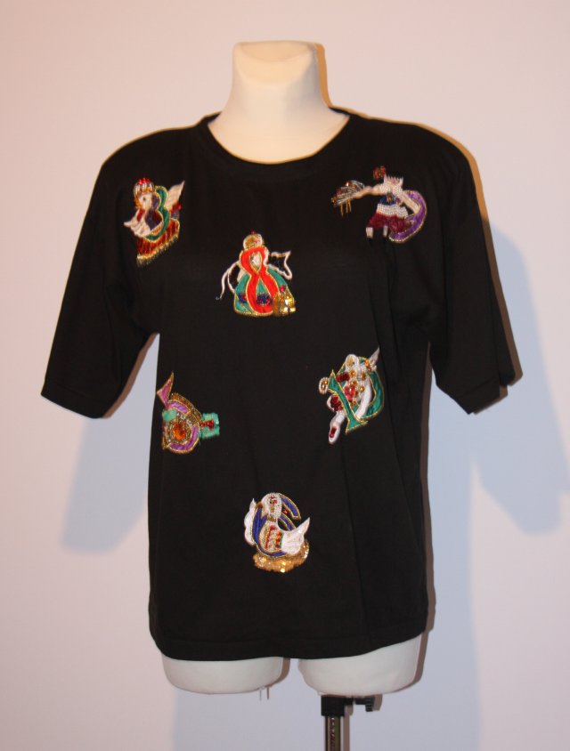 prosty czarny t-shirt vintage z krótkim szerokim rękawkiem, bogato zdobiony - wyszywane koralikami i cekinami cyferki z postaciami:), w ramionach poduszki