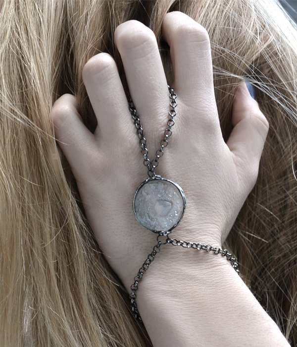 Przedstawiam niespotykaną bransoletkę ze szkłem pełnym bąbelków. Szkło oprawione w stylizowaną na stare srebro ekologiczną cynę. Bransoleta o obwodzie 19 cm z 5 cm łańcuszkiem do regulacji. Obwód łańcuszka na palec to ok. 10 cm. Średnica szkła to ok. 2,5 cm. Bardzo chętnie wykonam bransoletkę w innym rozmiarze! Biżuteria w 100% wykonana ręcznie, poszczególne sztuki mogą się minimalnie różnić.
