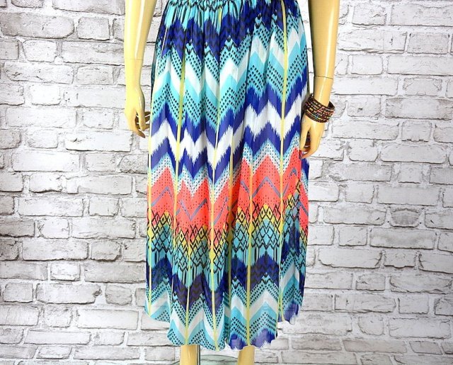 Olśniewająca sukienka w azteckie wzory w klimacie boho, sukienka o rozłożysta o mocno poszerzanym kroju , wykonana z transparentnej tkaniny, sukienka z delikatnym subtelnym dekoltem , w pasie na gumce. Całość na podszewce. Dominujące kolory :Błękit, fluo róż, granat, biel. Na żywo jeszcze piękniejsza.