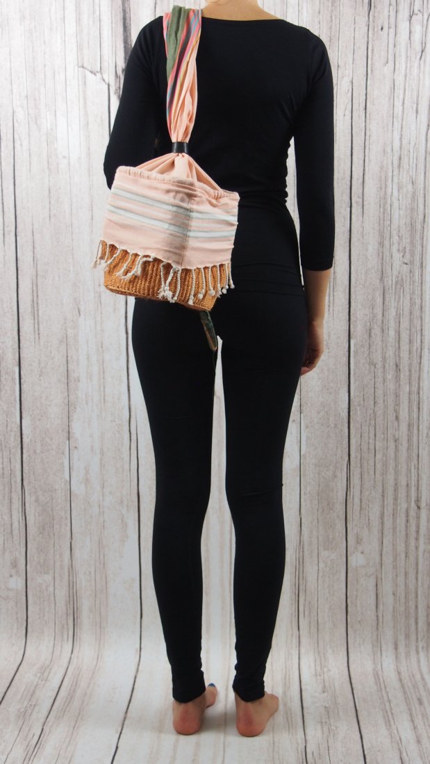 Mega oryginalny wiklinowy koszyk z płócienną rączką. Z Frędzlami. Góra zamykana na zasuwkę. Pasek wiązany, można sobie regulować jego długość (można nosić na ramieniu, lub przełożyć przez ramię).