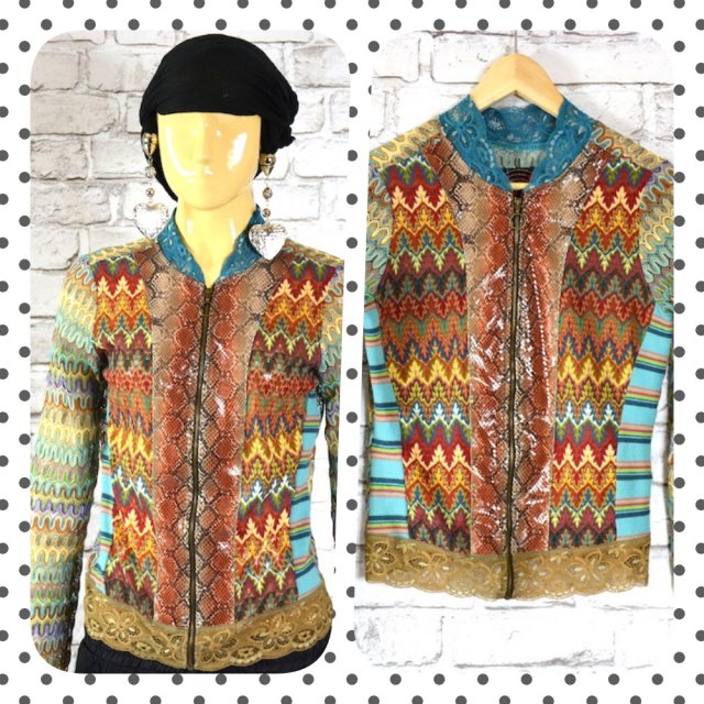 Kolorowy dopasowany blezer w stylu boho o dopasowanym kroju wykonany z delikatnie elastycznej ażurowo-koronkowej tkaniny. Zasuwany na suwak,fajny kolorowy, z przodu przy linii suwaka posiada wstawki ala skóra węża, rękawy w gęstszy ażur, wykonczenia koronkowe.