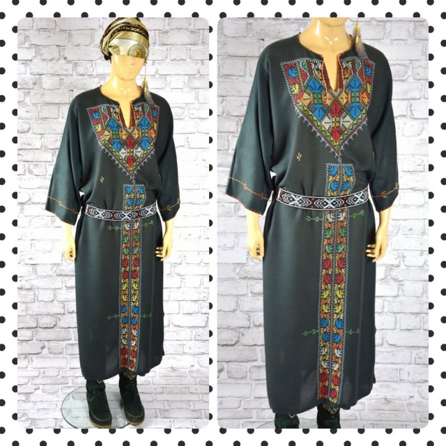 Długa sukienka boho w kolorze jaśniejszej czerni z przodu w haftowane różne wzory, sukienka o luźnym oversizowym kroju, u dołu po bokach krótkie rozcięcia.Sukienka wykonana z nieelastycznej tkaniny( materiał jest w mikroskopijne dziurki . Świetna noszona zarówno z paskiem jak i bez (sprzedaję bez paska).
