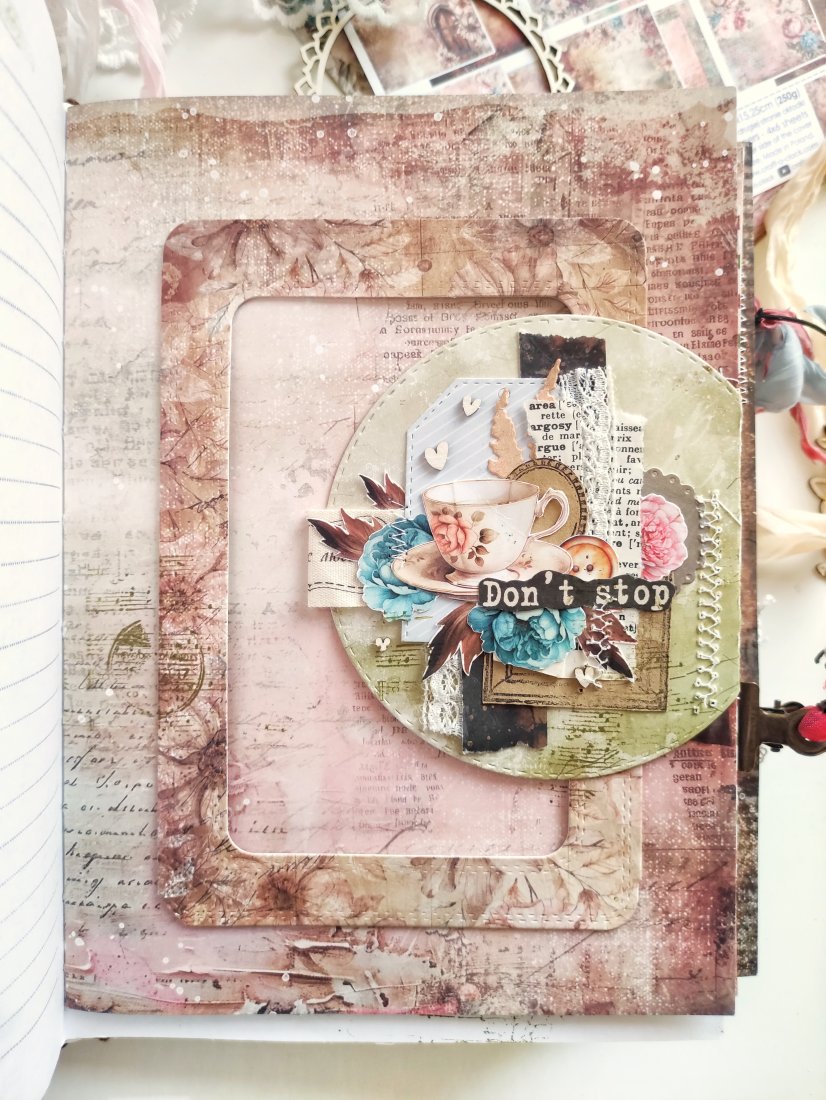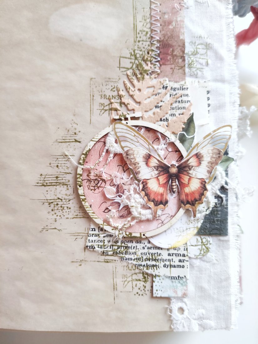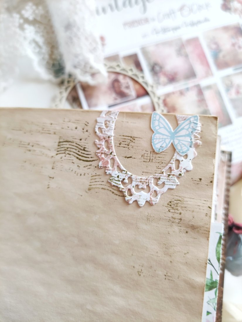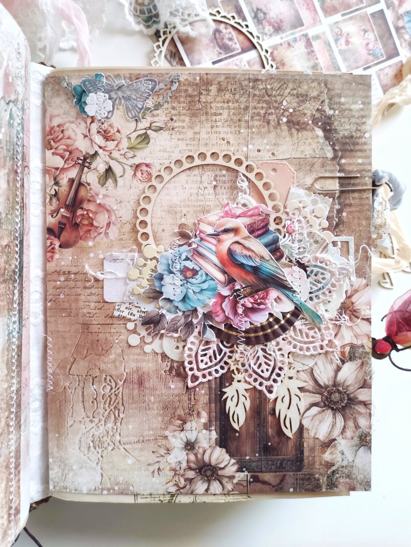 Ten unikatowy notes posiada miękką, tekstylną okładkę z koronkowymi detalami, które nadają mu romantyczny i artystyczny charakter. W środku znajdziesz kawą barwione strony, papiery w stylu vintage oraz warstwowe kompozycje. Liczne kieszonki i schowki idealnie sprawdzą się do przechowywania notatek, zdjęć, biletów i drobnych pamiątek.