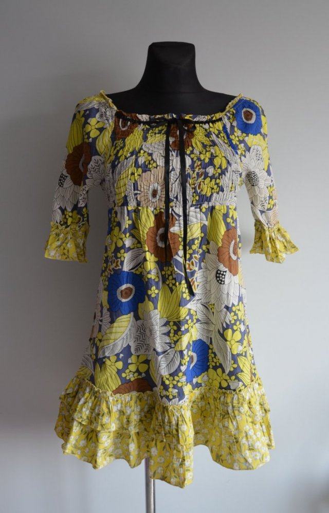Urocza krótka sukienka z kolorowym motywem kwiatowym w stylu Boho. Dekolt w łódkę, ozdobiony czarną tasiemką. Góra na przodzie odcięta, marszczona, na gumeczkach, bardzo elastyczna. Rękawy 3/4 zakończone falbanką na gumce. Dół luźny, rozkloszowany, zakończony falbanką. Lekka i zwiewna.