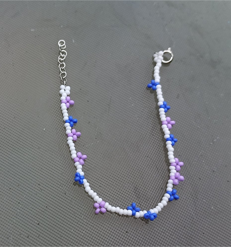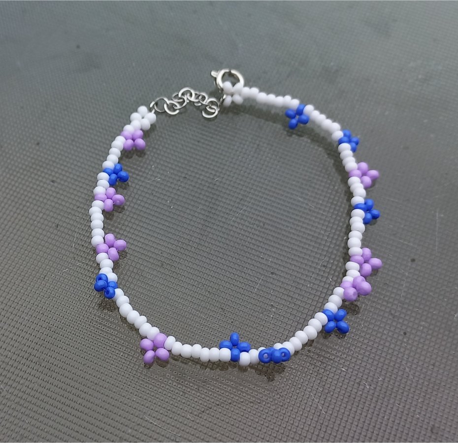 Minimalistyczna elegancja w pastelowym wydaniu. Bazą bransoletki jest jeden rząd białych koralików o wysokim połysku, ozdobiony ręcznie plecionymi kwiatkami w kolorach błękitu i fioletu. Dzięki jasnej kolorystyce bransoletka pięknie podkreśla opaleniznę i rozświetla każdą stylizację.