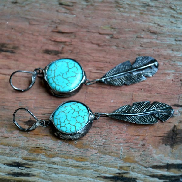 Długie, lekkie, idealne na lato kolczyki z kamieniami i metalowymi piórami. Oprawa w kolorze starego srebra nadaje kolczykom uroku. Długość całego kolczyka to ok. 8 cm. Biżuteria w 100% wykonana ręcznie, poszczególne sztuki mogą się minimalnie różnić.