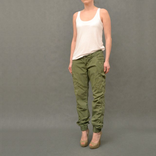 Spodnie typu bojówki w kolorze wojskowej zieleni. Na dole zakończone ściągaczem. Na nogawkach ukośne kieszenie. Marka GINA TRICOT.