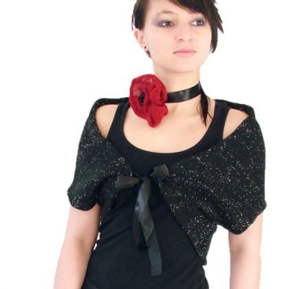 małe, czarne, ze srebrnymi refleksami, miękkie, puszyste; atłasowe tasiemki nadają romantycznego charakteru; idealne do narzucenia na wizytową koszulę, sukienkę wieczorową czy top; rozmiar uniwersalny