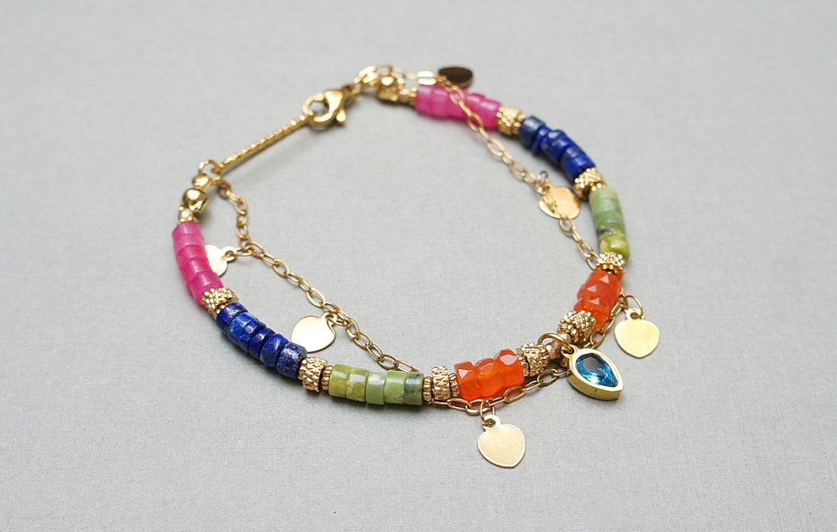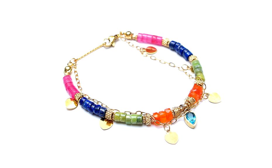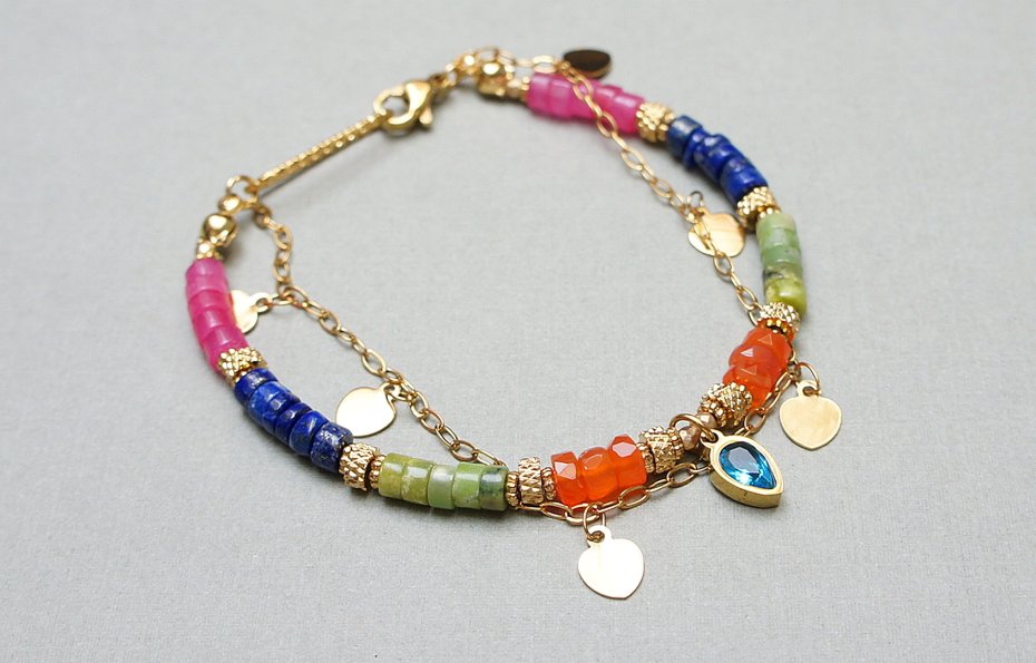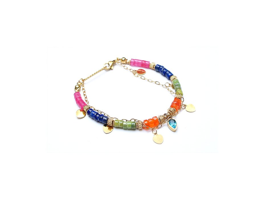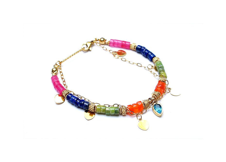 Bransoletka wykonana ze stali szlachetnej oraz naturalnych kamieni - talarków lapis lazuli [4 x 2mm], talarków jadeitu [4 x 2mm], talarków jaspisu [4 x 2mm], talarki karneolu [4 x 2mm] oraz zawieszki z cyrkonią w okuciu. Całkowita długość bransoletki: ok. 19cm. Biżuteria ozdobnie zapakowana.
