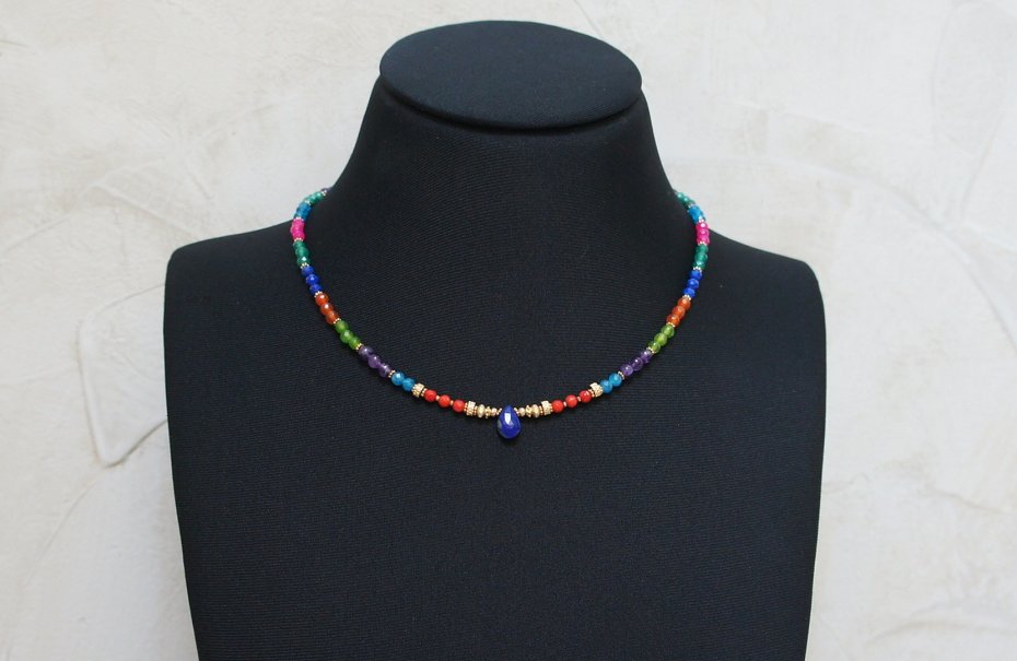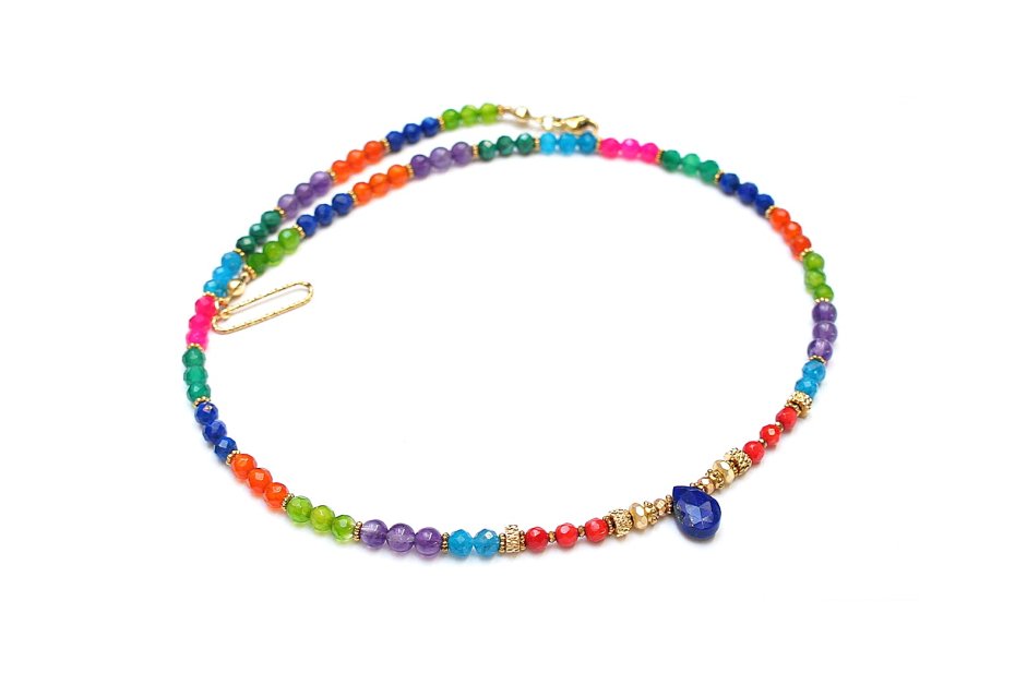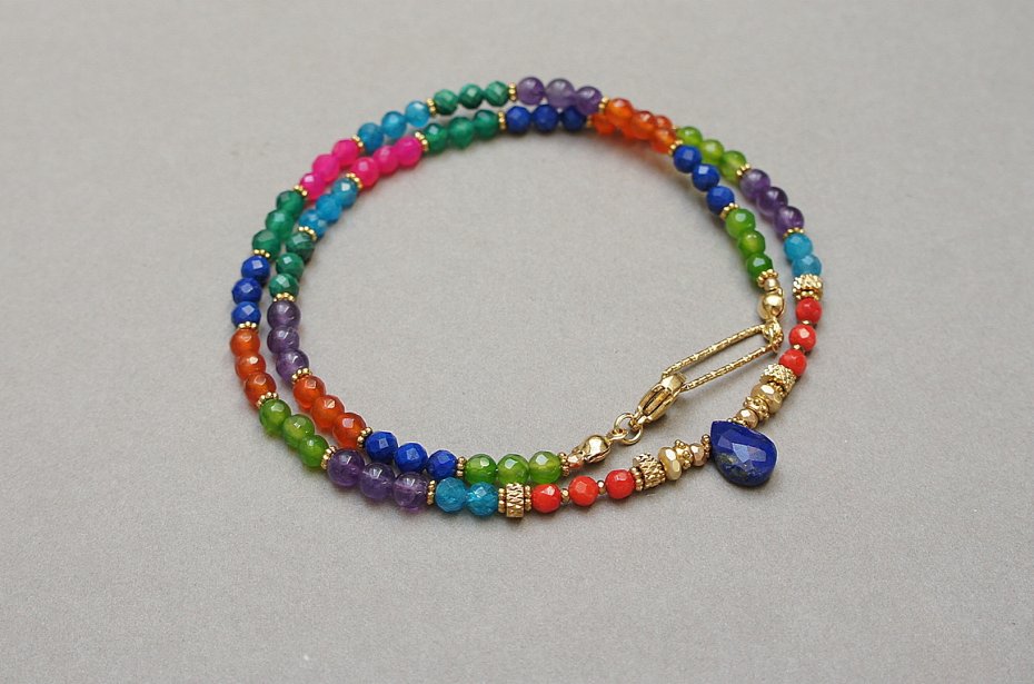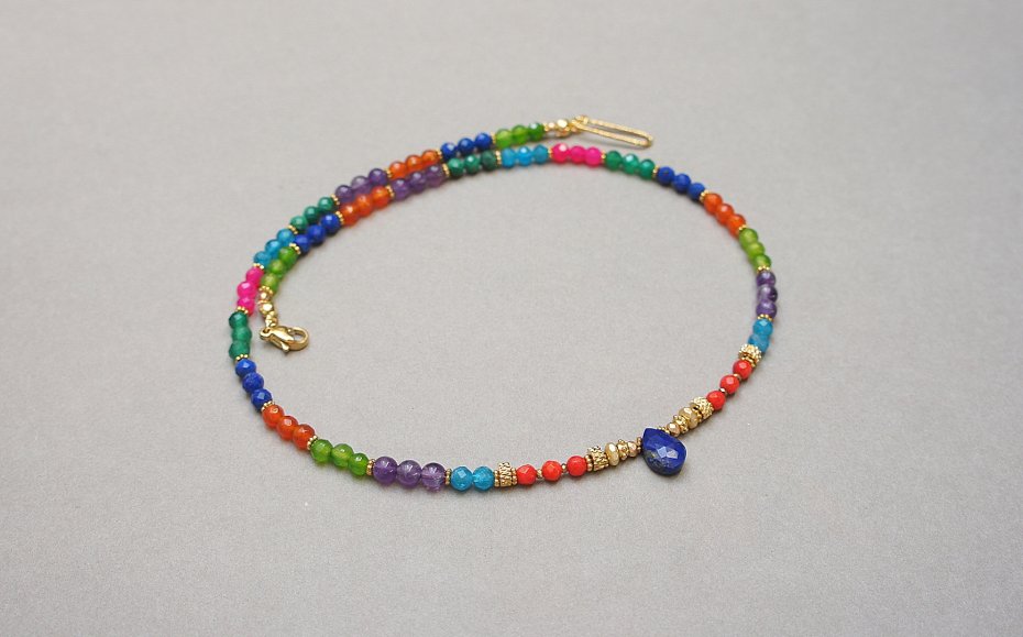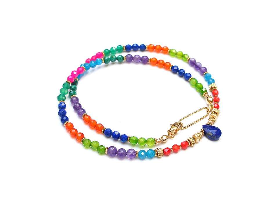 Krótki naszyjnik wykonany w całości z pozłacanej stali szlachetnej oraz naturalnych kamieni - lapis lazuli [3mm], malachit [4mm], koral naturalny [3mm],karneol [4mm], apatyt [4mm], ametyst [4mm], onyks zielony [4mm], agatów fasetowanych [4mm], brioletki lapis lazuli, hematytu matowego, platerowanego [4x2mm, 3x2mm oraz 2mm]. Naszyjnik o długości ok. 44,5cm. Biżuteria ozdobnie zapakowana.