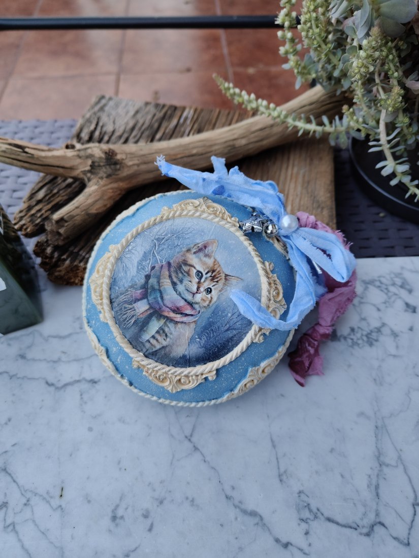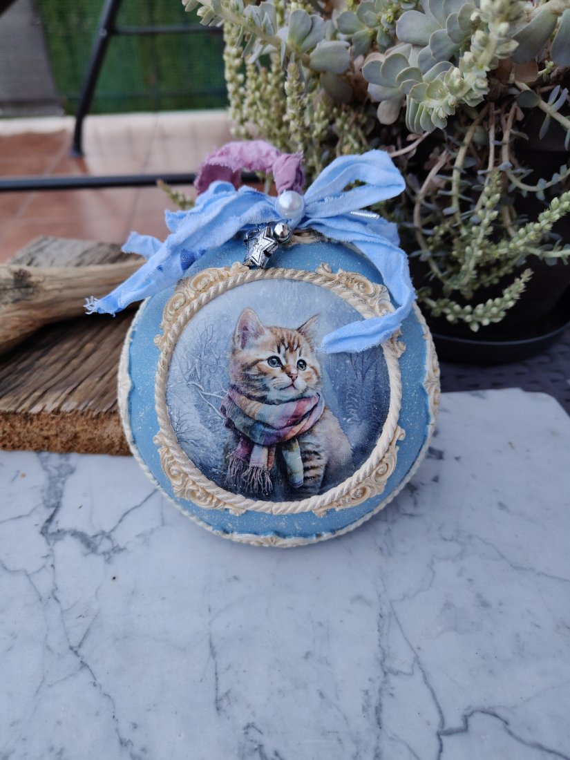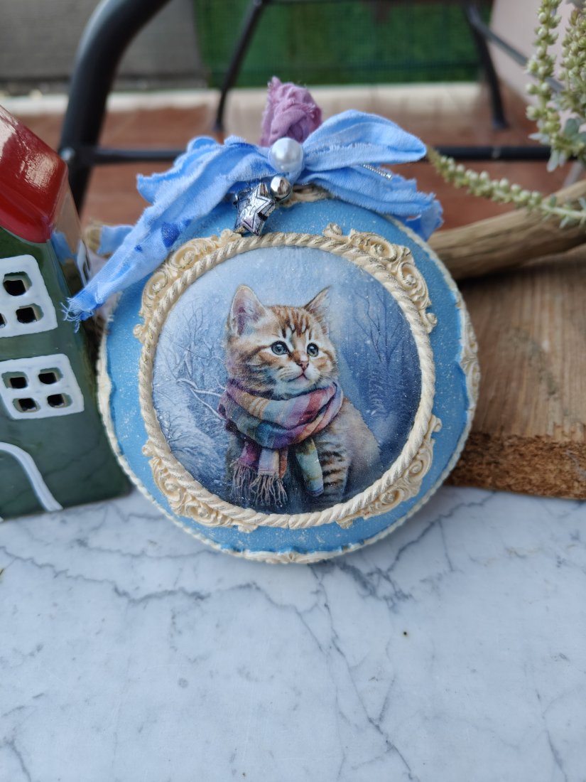 Tagi: #bombka choinkowa decoupage, #dekoracje świąteczne, #kot, #prezent świąteczny