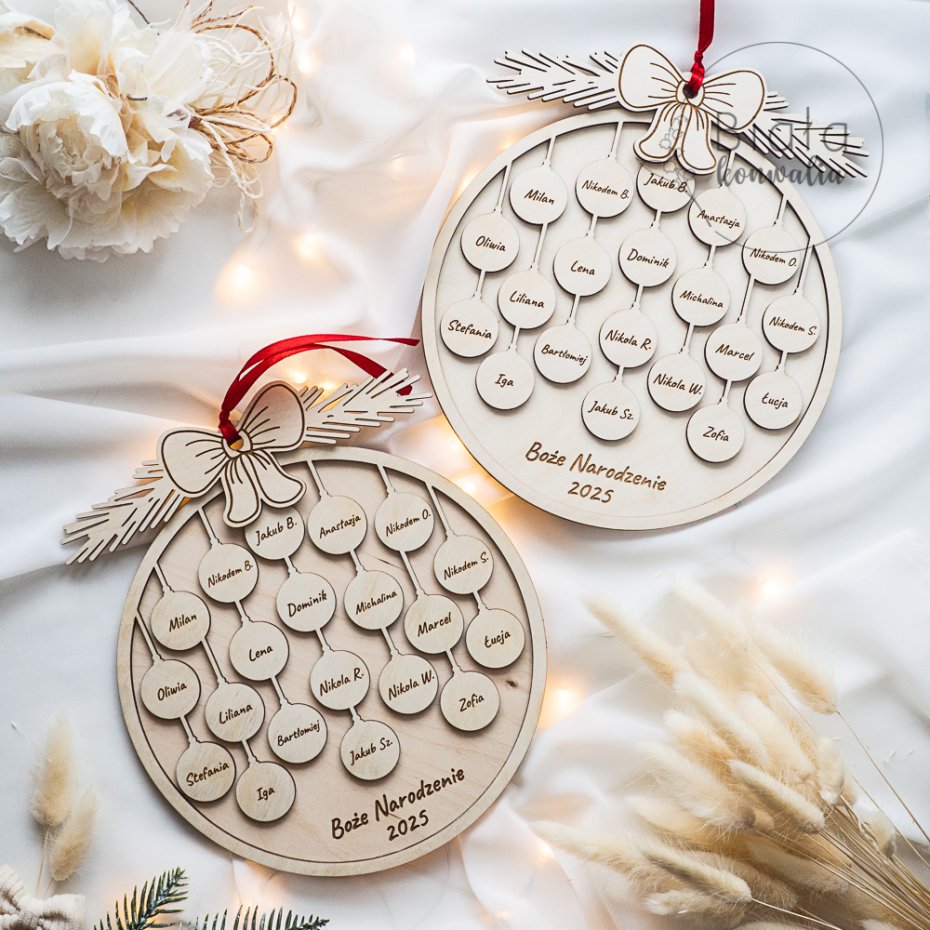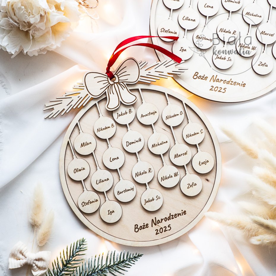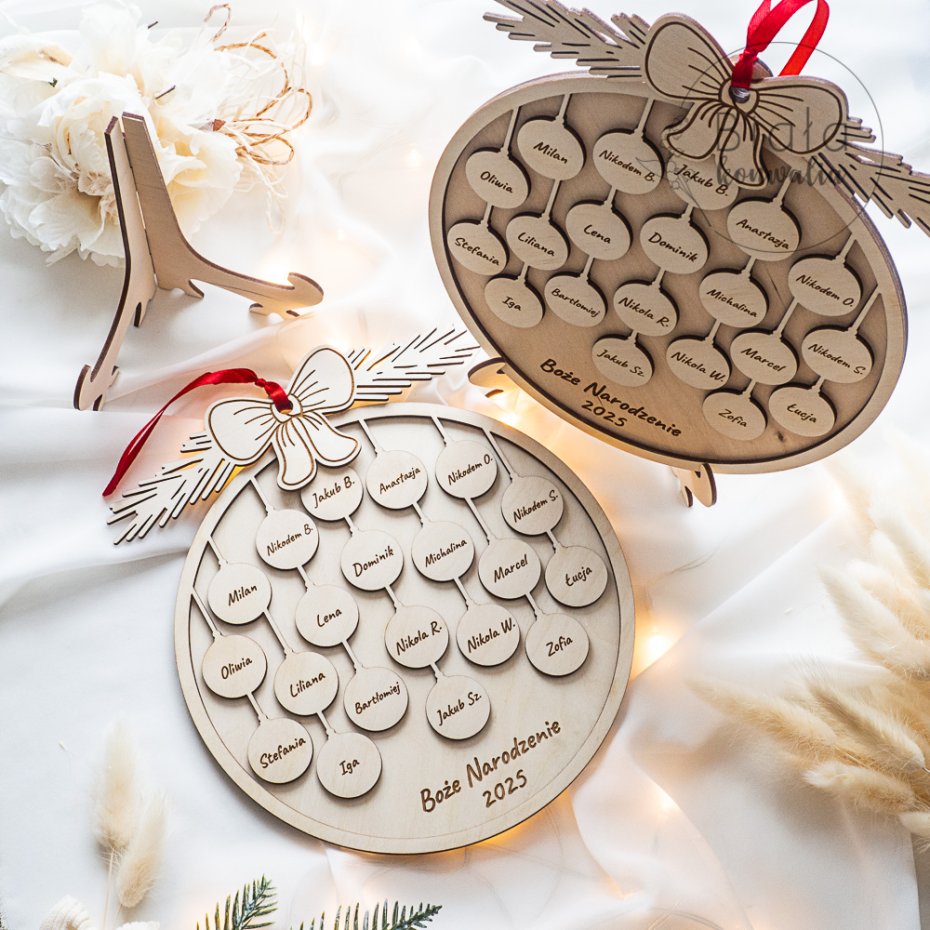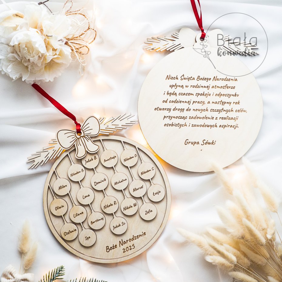 Nasza bombka została wykonana z wysokiej jakości sklejki, a każdy element - w tym mini bombki z imionami dzieci - jest precyzyjnie grawerowany a następnie szlifowany. Dzięki temu każdy uczeń staje się częścią pięknej, wspólnej dekoracji, która przez lata będzie przypominać o wyjątkowej klasie.