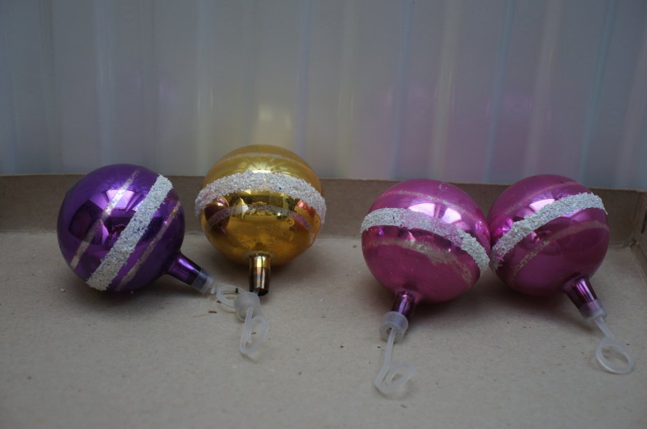 Wiekowe, szklane bombki choinkowe - 6 srebrnych i 1 czerwona. Srebrne bombki mają ślady zmatowienia, a czerwona bombka ma drobne odpryski farby. Mniejsze kolorowe bombki (5 sztuk) ozdobione są białym brokatem. Stan vintage. Pomimo tych niedociągnięć są urokliwe.