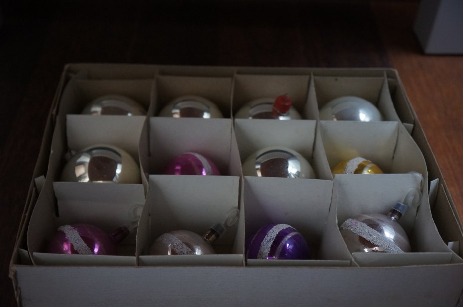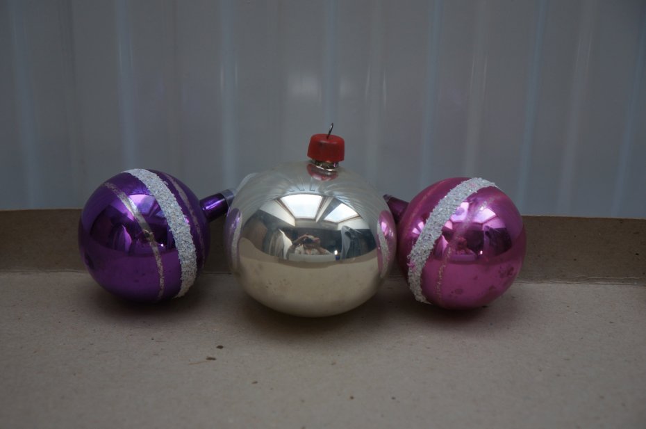 Wiekowe, szklane bombki choinkowe - 6 srebrnych i 1 czerwona. Srebrne bombki mają ślady zmatowienia, a czerwona bombka ma drobne odpryski farby. Mniejsze kolorowe bombki (5 sztuk) ozdobione są białym brokatem. Stan vintage. Pomimo tych niedociągnięć są urokliwe.
