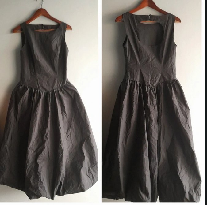 Długa sukienka z dopasowana góra i bombkowym dołem, pięknie się prezentuje na sylwetce zarówno do balerinek jak i glanów świetny materiał popelina nie lejący średniej grubości nadaje sukience stylu i formy, zapinana z boku na zamek długość 125 biust max 44x2 odcięcie/pas 40x2 stan idealny, kieszenie