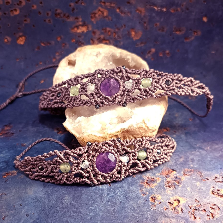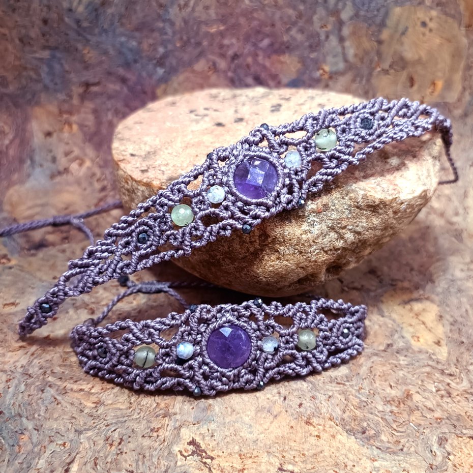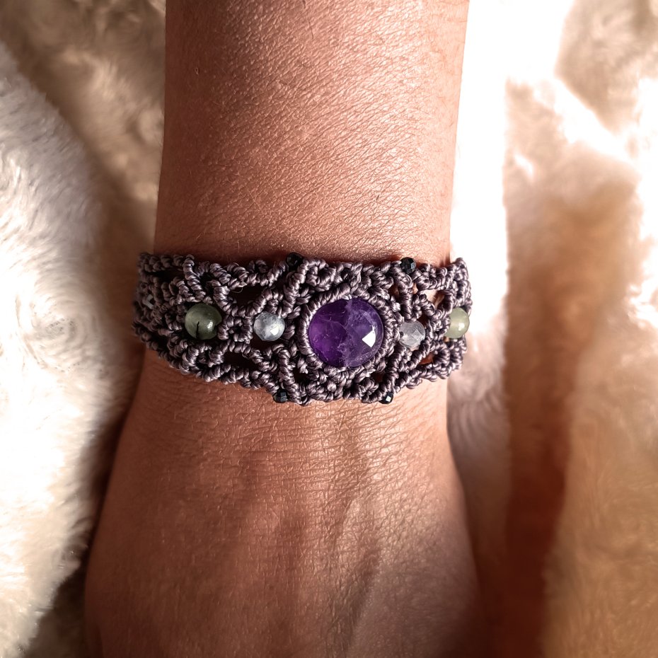 Użyte kamienie to: ametyst (12 mm), kamień księżycowy ( 5 mm), agat ( 6 mm), hematyt.