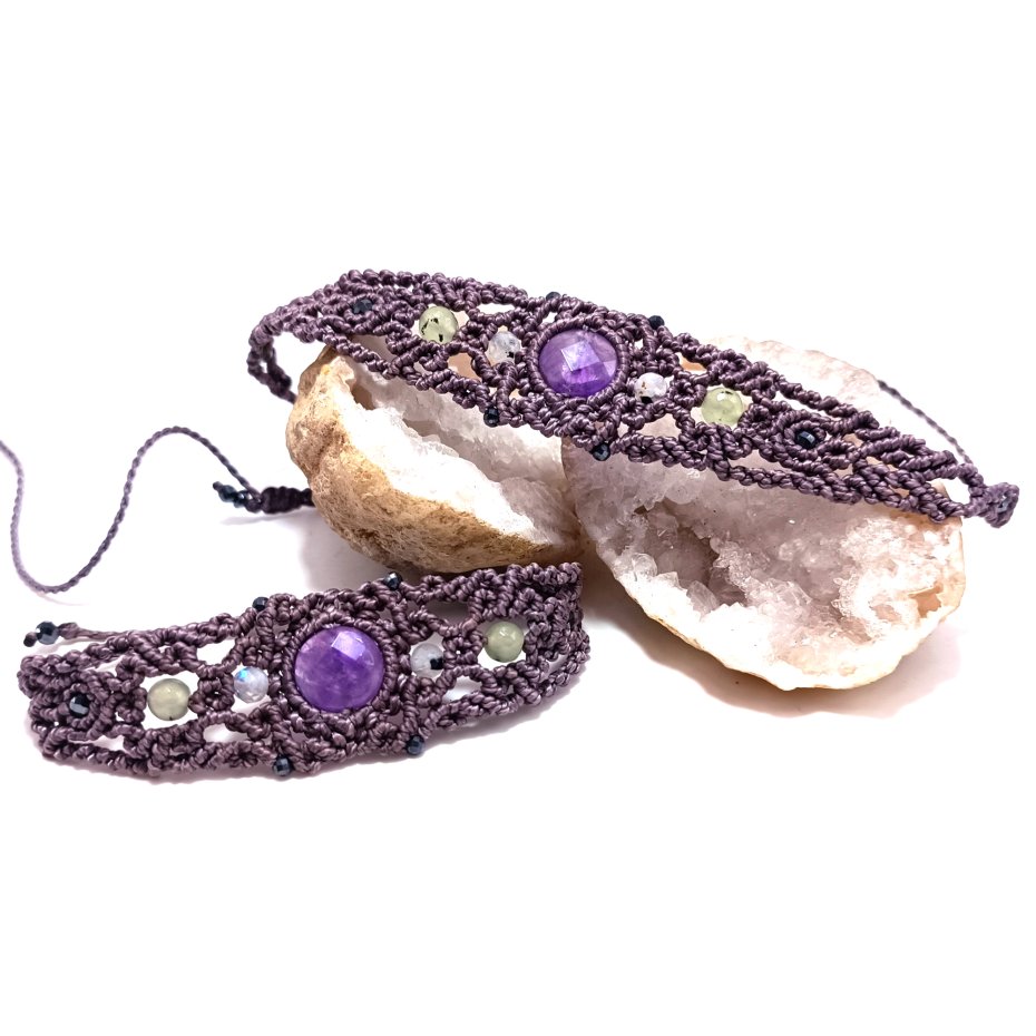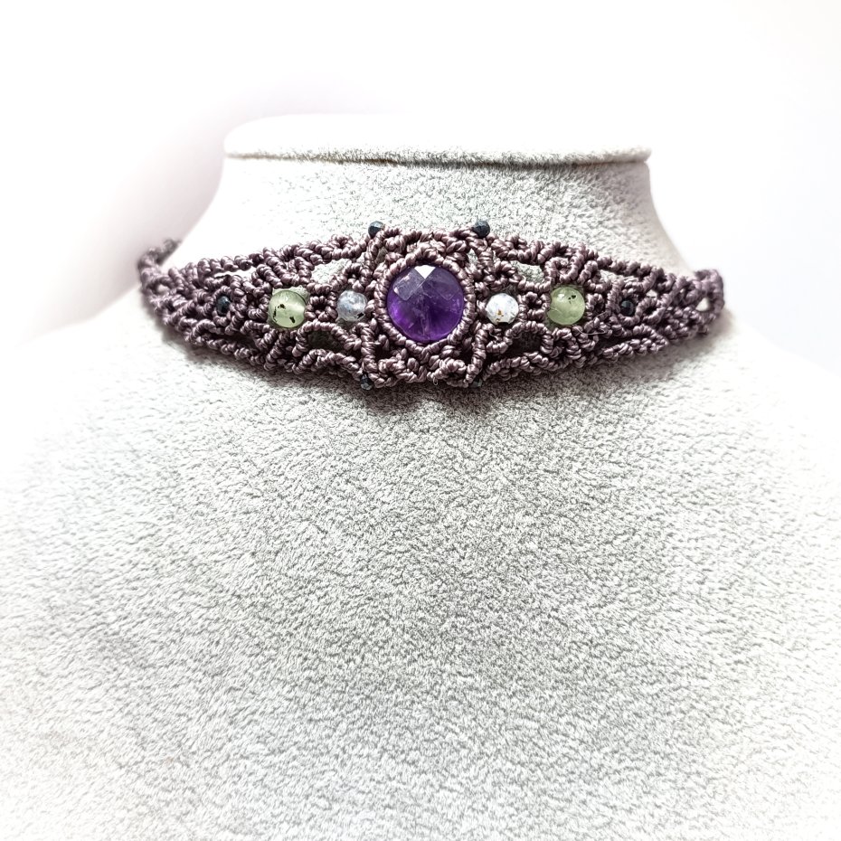 Naszyjnik - choker i bransoletka pleciona z ametystem naturalnym i kamieniem księżycowym