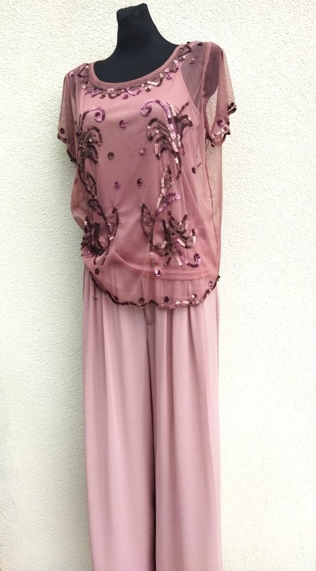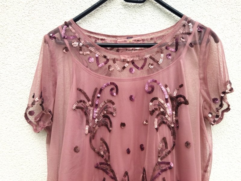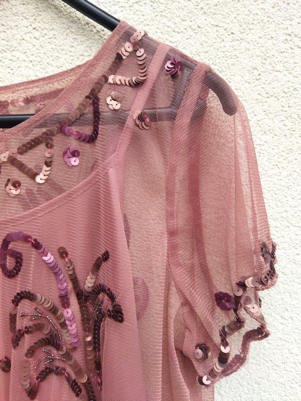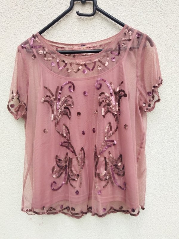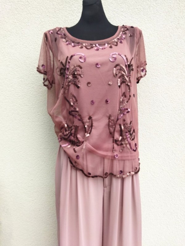 Efektowna bluzka z siateczkowej tkaniny poliestrowej w nieoczywistym kolorze zgaszonego weneckiego różu z kropla brązu pokryta obficie cekinowym haftem z przodu i z tyłu. Na koszulce w tym samym kolorze.