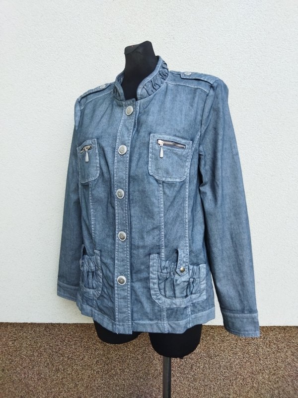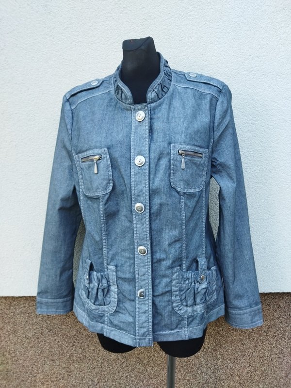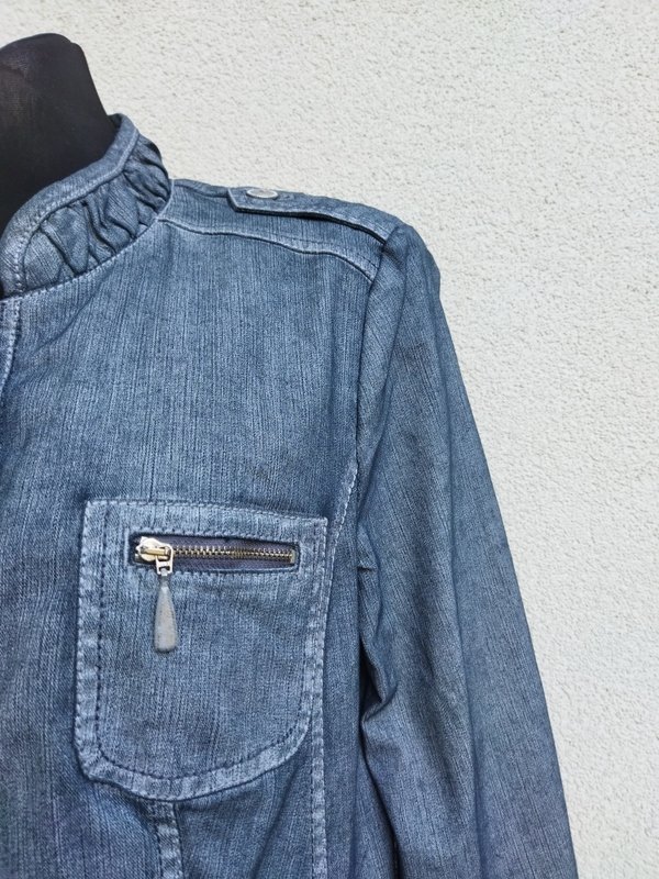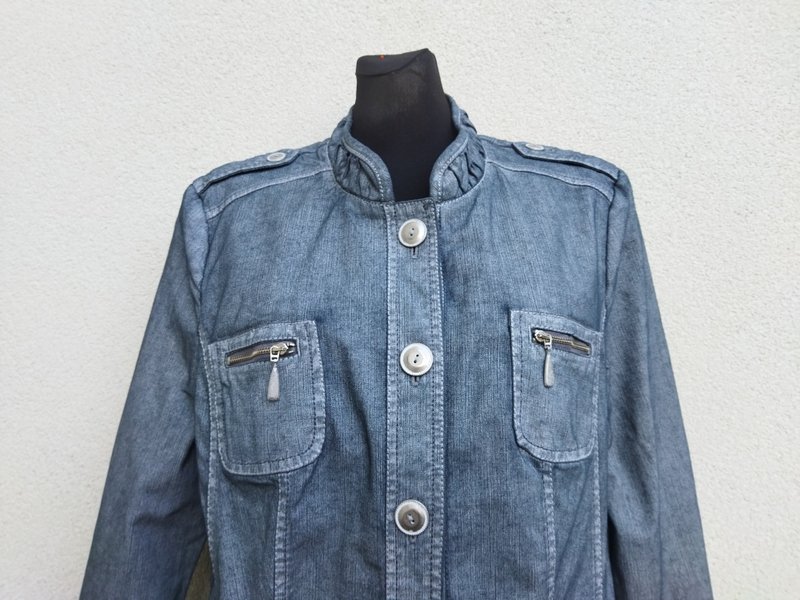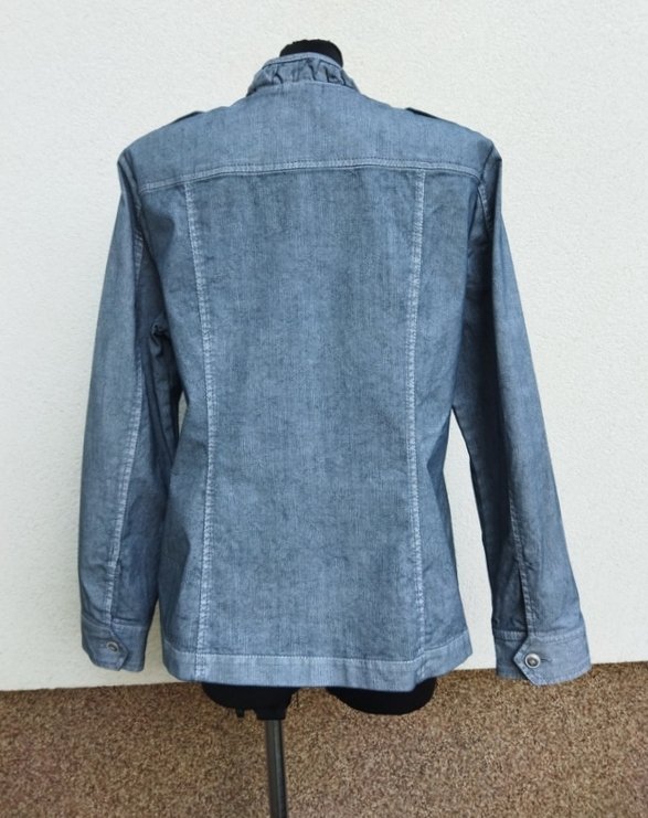 Porządna kurtka z grubszej tkaniny bawełnianej z elastanem, w stalowo-niebieskim kolorze , starannie wykończona z licznymi detalami. Na drapowanej stójce pod szyją , z czterem kieszeniami: dwie naszywane z rozsuwanymi zamkami u góry i dwie naszywane drapowane u dołu. Zapinana na guziki. Bez podszewki