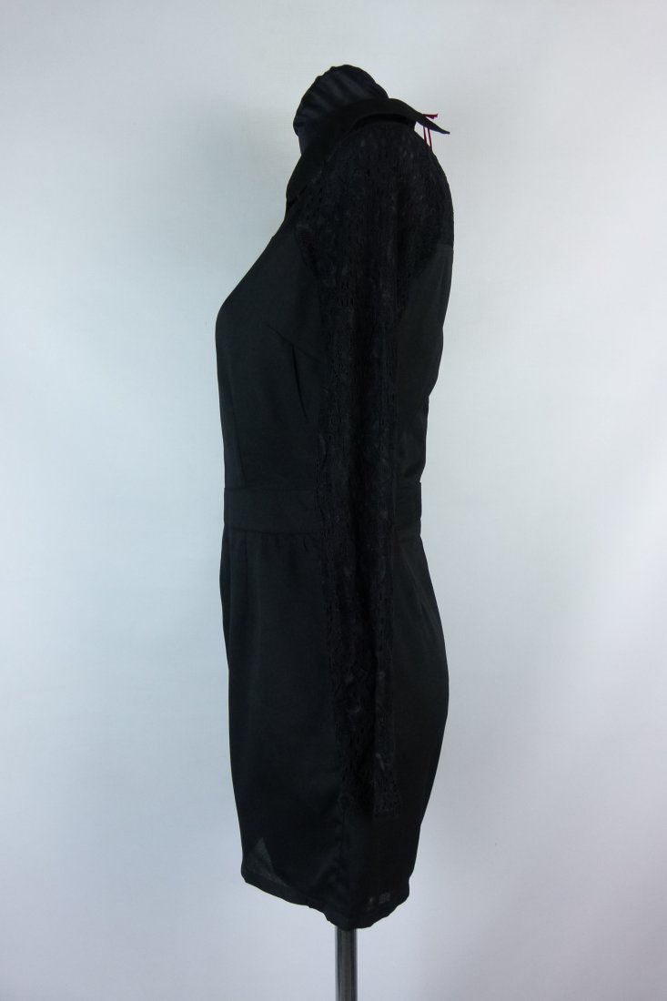 z tyłu zapinany na zamek , karczek i rękawy z elastycznej koronki
