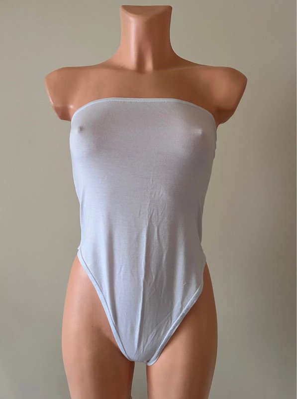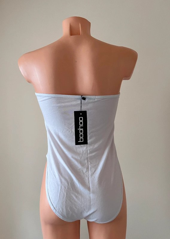 Nowe body z metką marki Boohoo, rozmiar to L 40. Jest przewiewne, bo wykonano je z wiskozy. Nie ma zapięcia w kroku. Materiał jest bardzo elastyczny.