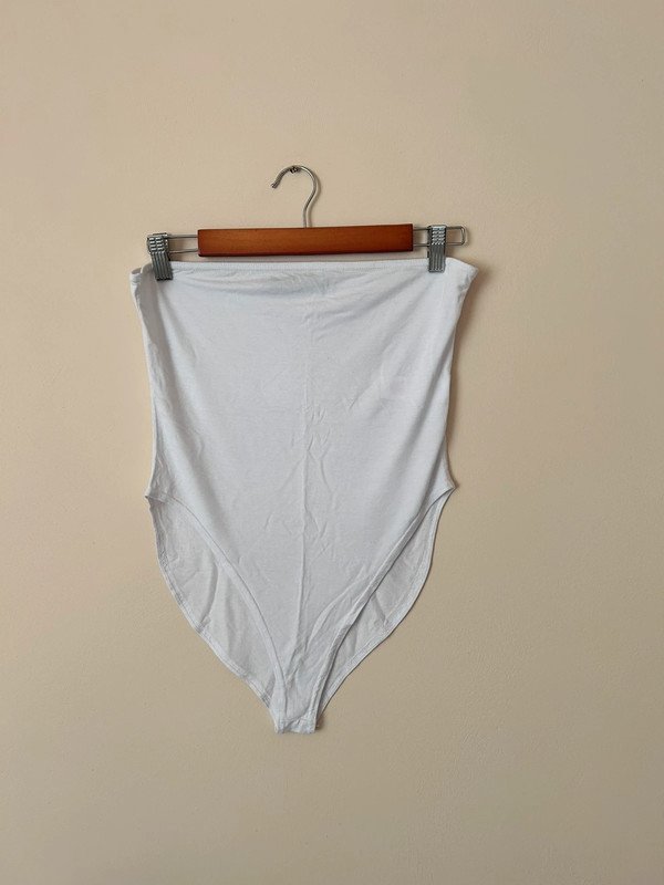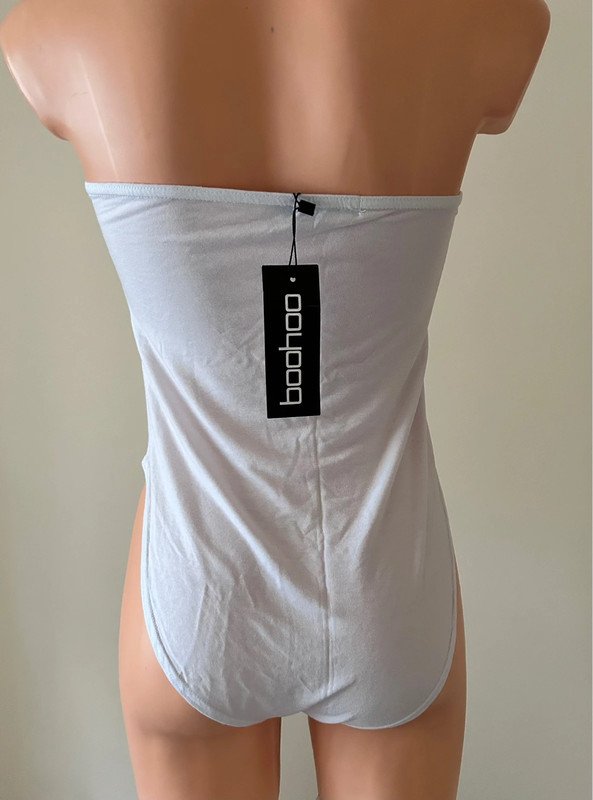 Nowe body z metką marki Boohoo, rozmiar to L 40. Jest przewiewne, bo wykonano je z wiskozy. Nie ma zapięcia w kroku. Materiał jest bardzo elastyczny.
