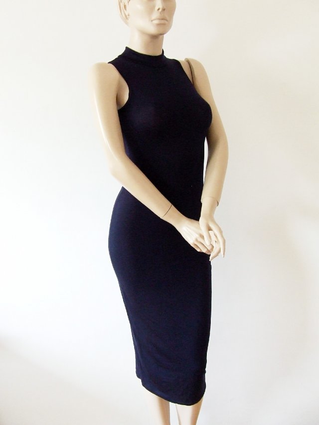 Świetna casualowa, minimalistyczna, elastyczna, dopasowana sukienka z małym golfem, zwężana ku dołowi. Kolor granatowy.