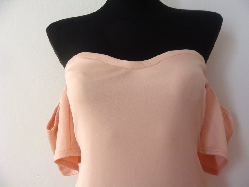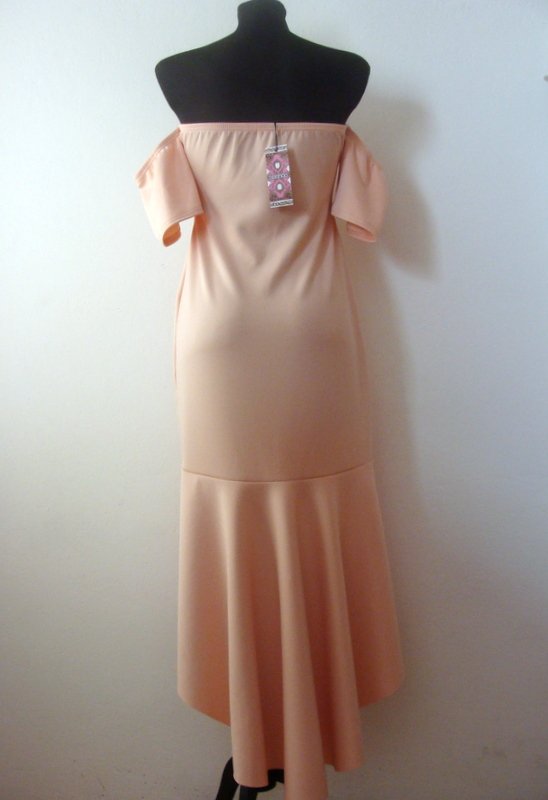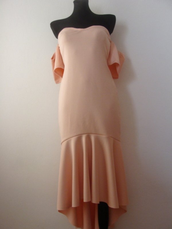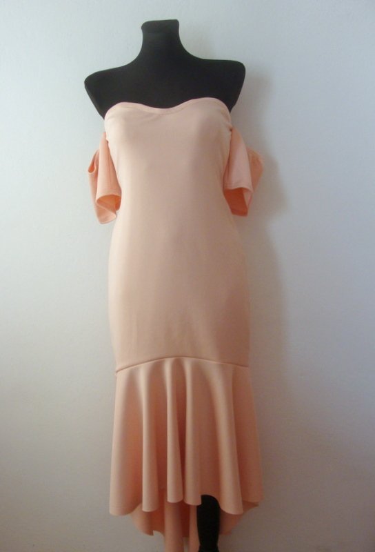 Przepiękna sukienka z poliestrowej tkaniny dzianinowej w delikatnym jasno morelowym kolorze . Wciągana na biust , z tyłu na plecach wszyta gumka , doszywane rękawki z gumką u góry. Przód z podwójnej tkaniny do linii wszycia falbany. Asymetryczna - w okolicach kolan doszyta falbana cięta z pół koła - dłuższa z tyłu. Sukienka rozciągliwa