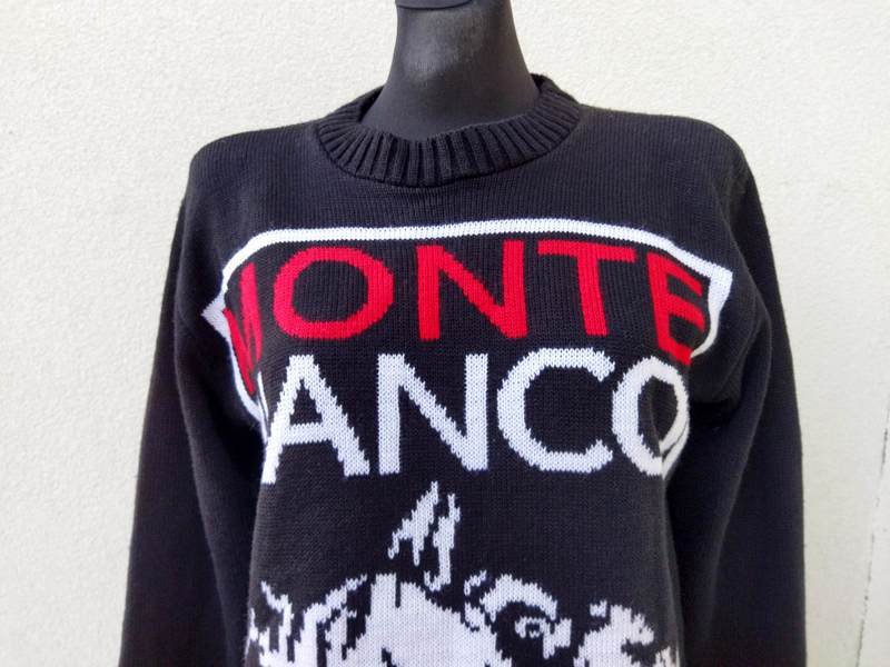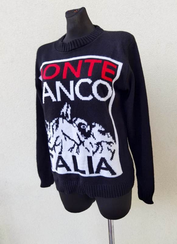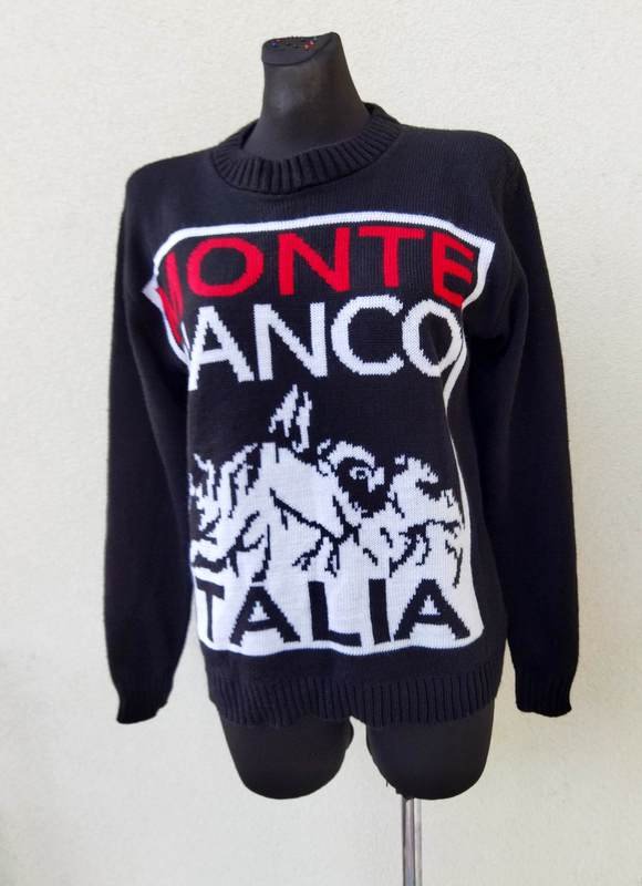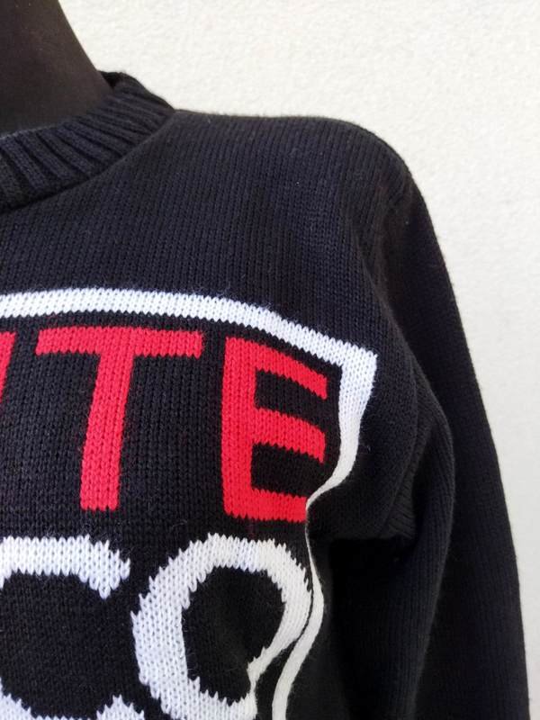 miły akrylowy sweter w czarnym kolorze z napisami i wzorami w czerwonym i białym kolorze. Wykończony ściągaczami.