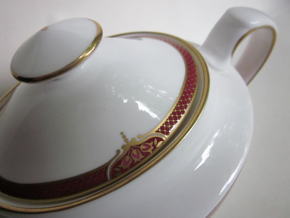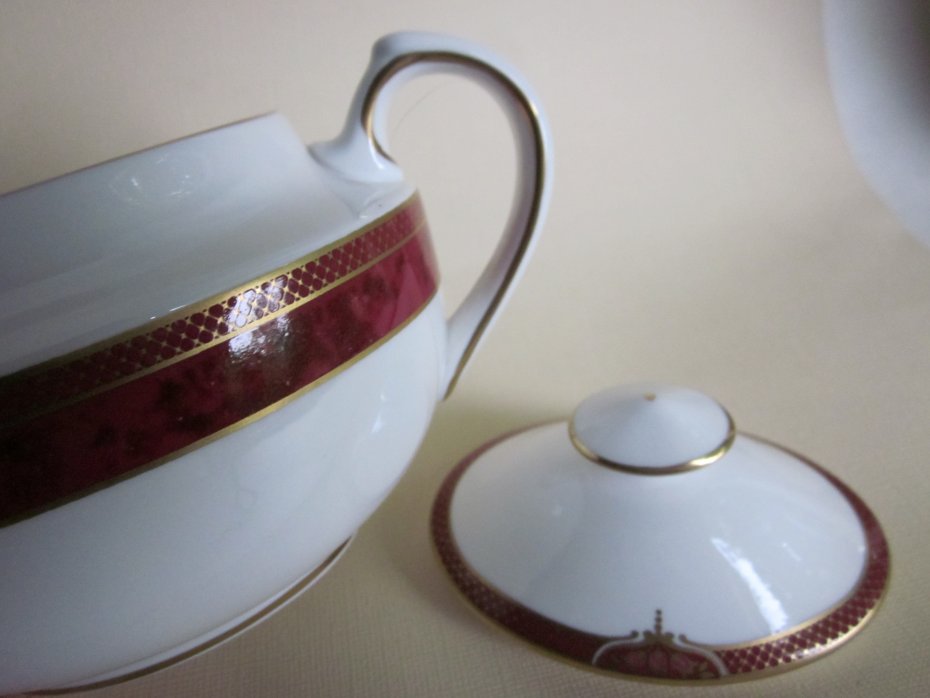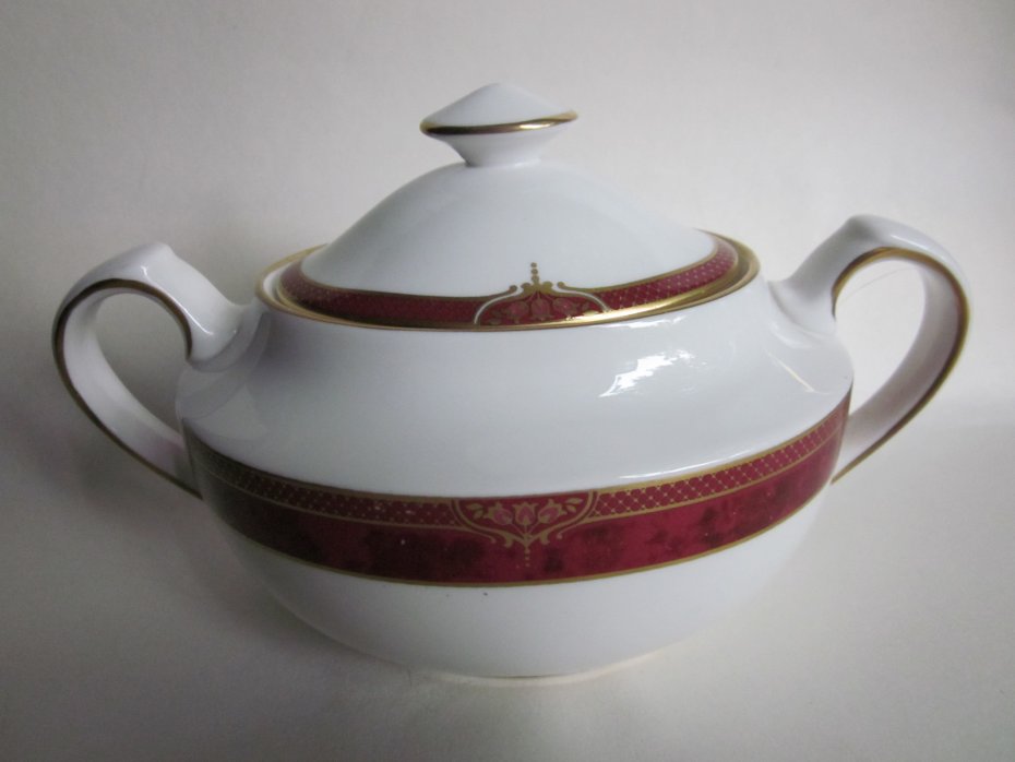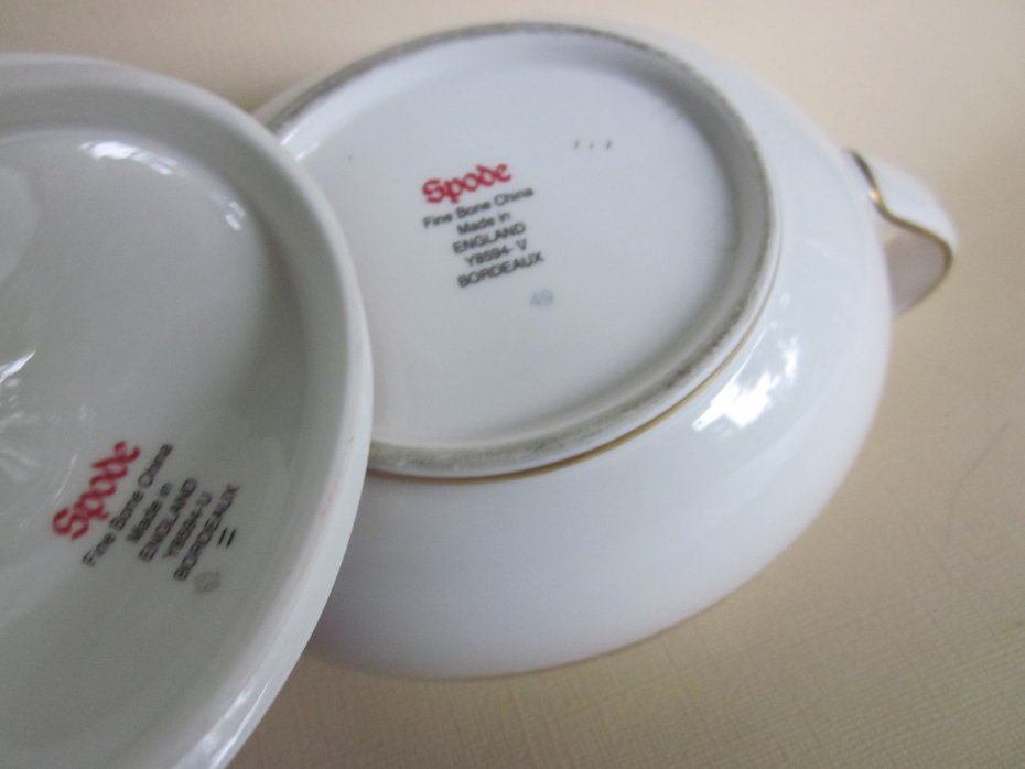 Rarytas - SPODE BORDEAUX Y 8594 -V. Nie często spotykana na rynku polskim i nie tylko, bo zamknięta jest już seria BORDEAUX od Spode . Produkowana w latach 1995 -2009, elegancka, klasyczna, złocona 22 karatowym złotem ( Sic! ). Szlachetna, dźwięczna, pod światło prześwitująca porcelana i Fantastyczna eliptyczna forma z wykwitnie zdobnym uchwytem. Duża cukiernica -bomboniera. Wyszukana forma, eleganckie zdobienia. Przykrywka z rantem zabezpieczającym przed spadaniem. Marmurkowe tło zdobienia, delikatnie wyczuwalne pod dłonią. Subtelne, eleganckie złote wzory. Wykończenie rantów również złote i jak wisienka na torcie -złota kropeczka na górze uchwytu. Wykończenie tła satynowe, bieli satynowo - błyszczące. Klasa I szyk. Szerokość około 16,5 góra 9 x 6,5 otwór 7,5 x 5 pękatość 12,5 x 10 dół 7 x 6 wysokość z przykrywką 10 , bez przykrywki prawie 7 cm . Stan zachowania bardzo dobry. Rarytas do kolekcji, lubego użytkowania I na wyszukany prezent;)