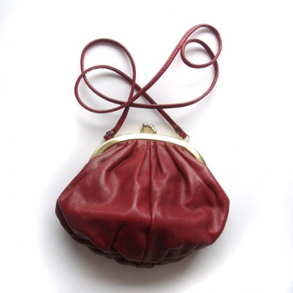 Mała torebeczka na bigiel w kolorze bordowym, do noszenia na krzyż. Pasek dł. 110cm. Szer. 22cm, wys. 18cm. Torebeczka z jednej strony posiada otarcie skórki (widać to na zdjęciu-zbliżeniu), ale nie widac nic, jeśli ta strona torebki znajduje sie przy udzie.