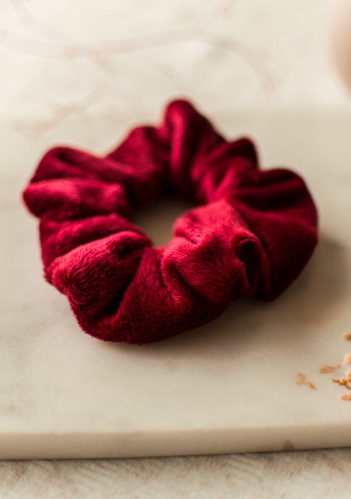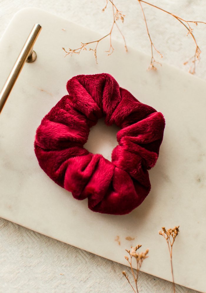 Bordowa gumka z welurowego materiału. Miła w dotyku.