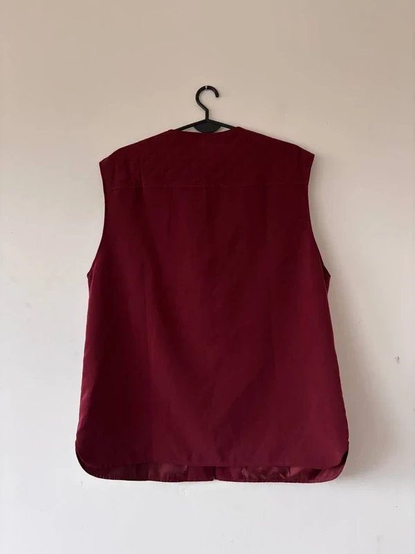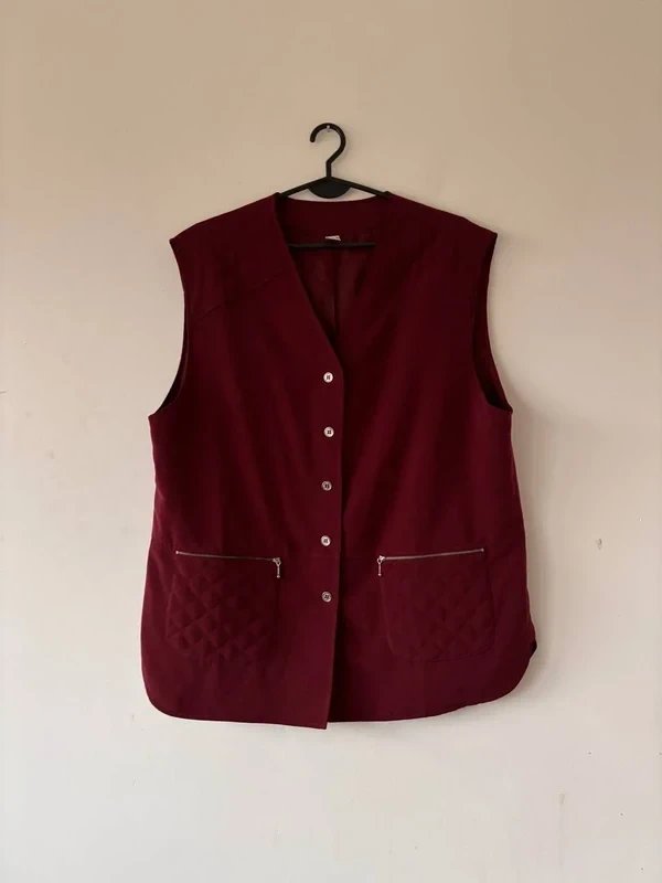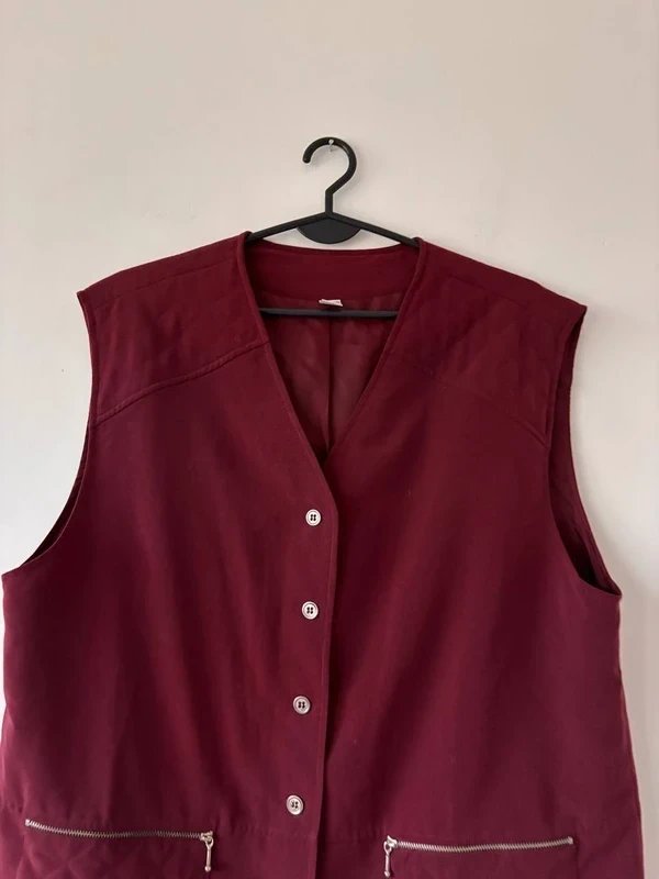 Bordowa damska kamizelka o klasycznym, wygodnym kroju. Model zapinany na guziki, z przodu dwie praktyczne kieszenie zapinane na zamek – dekoracyjnie pikowane, co dodaje całości charakteru. Tkanina jest lekka i miękka, idealna do noszenia na co dzień, do pracy lub na spacer.