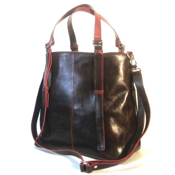 Duża torebka uszyta ze skóry w kolorze bordowym. Uchwyty i szlufki ciemno czerwone. Skóra gładka, z naturalnym połyskiem.