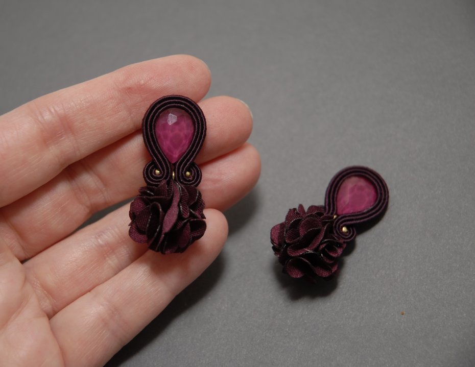 oferuję klipsy zrobione techniką sutasz, ozdobione fasetowanym kaboszonem i kwiatkami z materiału