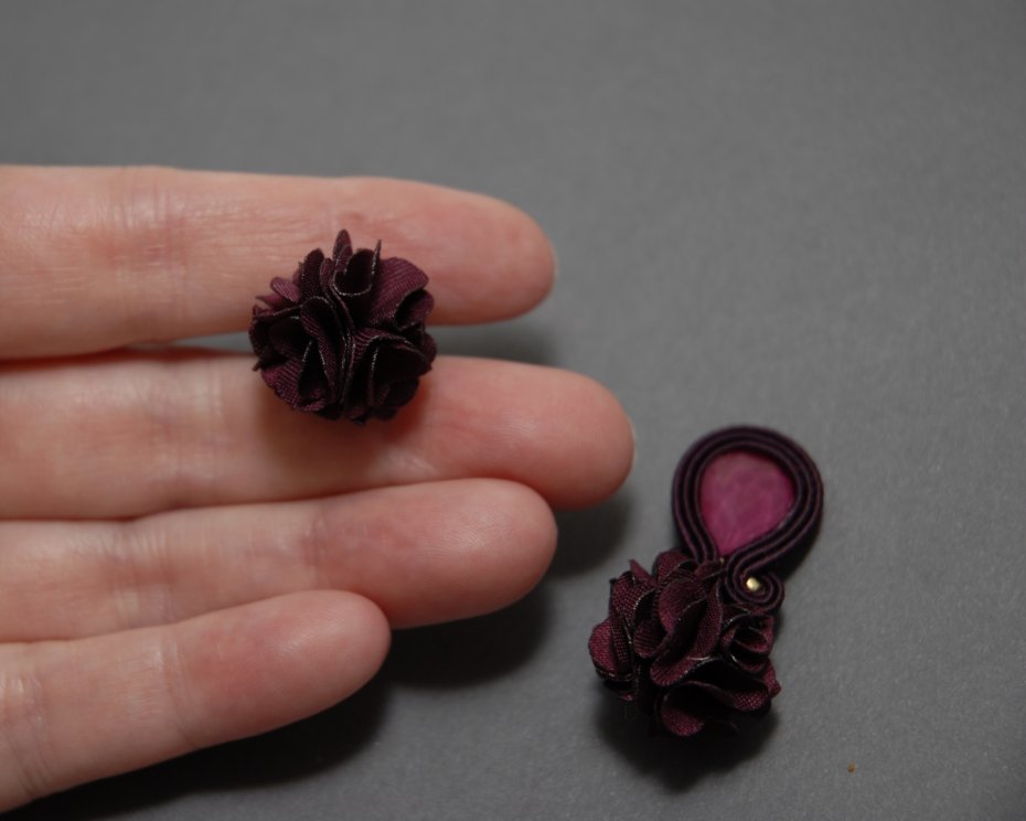oferuję kolczyki zrobione techniką sutasz, ozdobione fasetowanym kaboszonem i kwiatkami z materiału