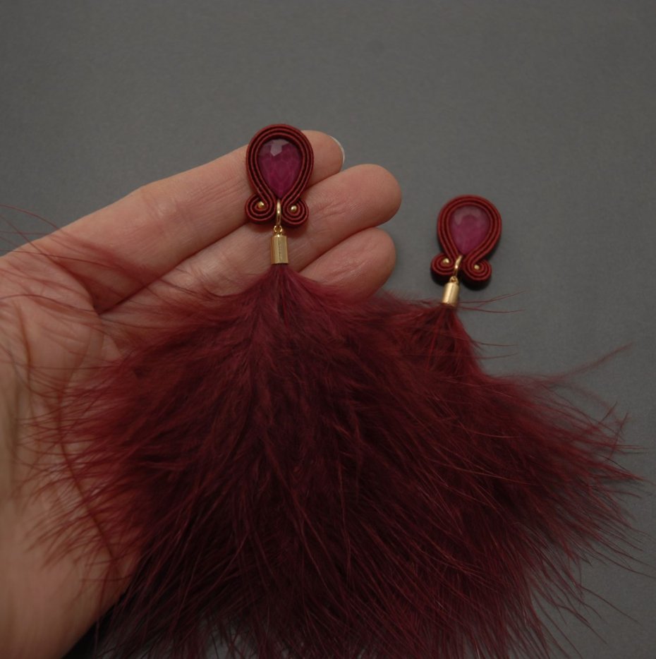 oferuję kolczyki zrobione techniką sutasz, ozdobione fasetowanymi kaboszonami i delikatnymi piórami