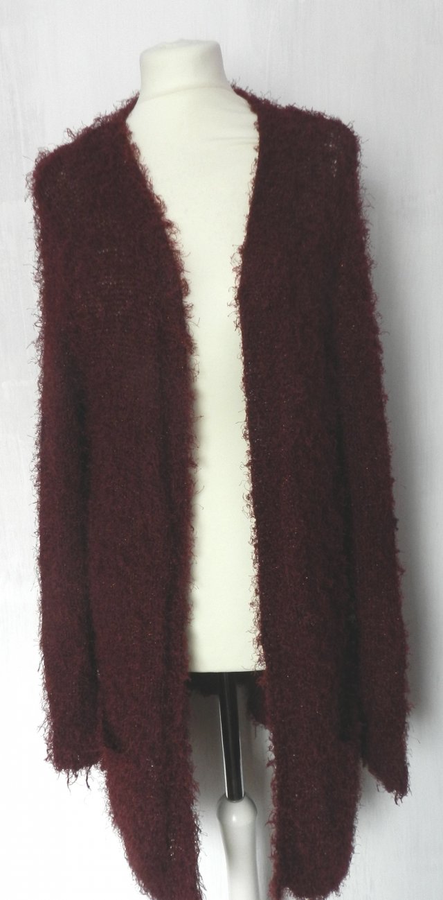 Rewelacyjna długa narzuta z włochatą fakturą w kolorze ciemnym bordo z kieszeniami u dołu