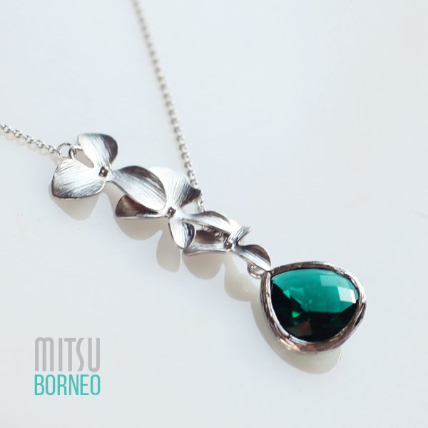 Delikatny ale wyrazisty naszyjnik. zbudowany z listów , drobniutkiego łańcuszka oraz kryształu. Naszyjnik mierzy 42,5 cm plus 3 cm wisiorek - jeden listek i kryształ. Krystał mierzy 15 x 18 mm - barwa szmaragdowa. Naszyjnik podróżuje ładnie zapakowany.