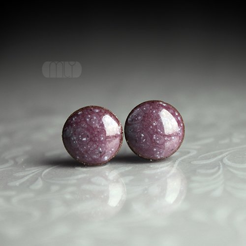 Okrągłe, lekko nieregularne ceramiczne kolczyki w formie sztyftów, ręcznie wykonane z delikatnej czekoladowobrązowej gliny kamionkowej, jednostronnie szkliwione mieszanką fioletowych szkliw z efektem plamek i subtelnym połyskiem, na antyalergicznych sztyftach w kolorze srebrnym. Średnica ok. 9mm.Polecam