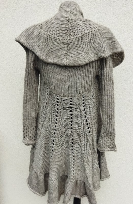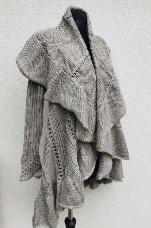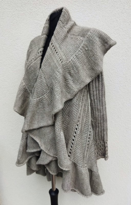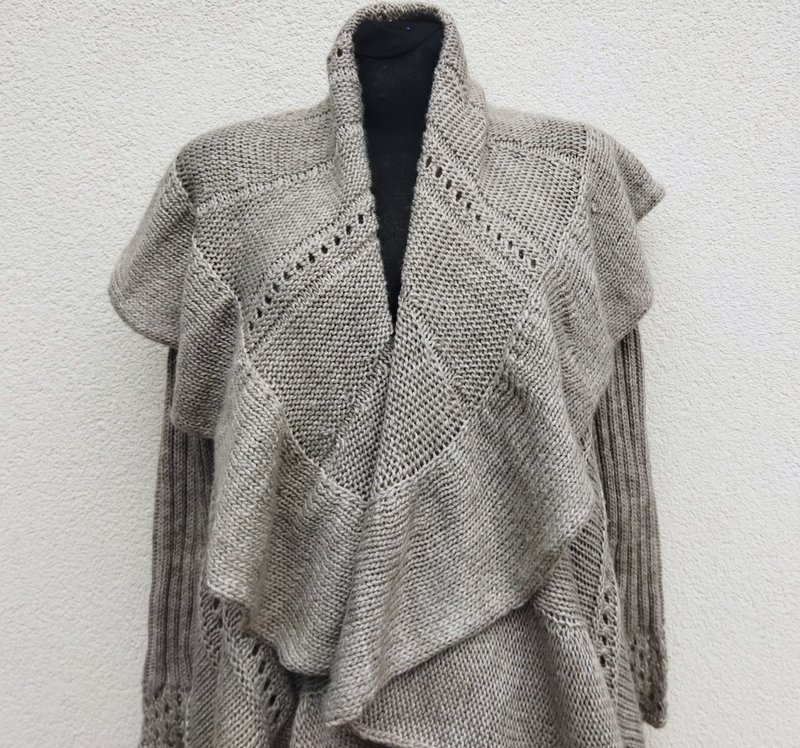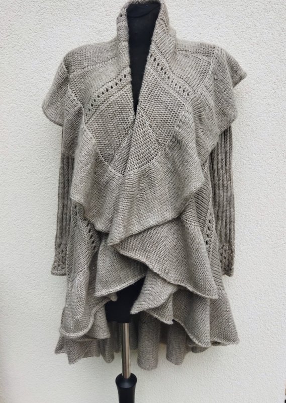 Sweter z wełnianej włóczki i akrylu w kolorze chłodnego beżu z pięknymi wzorami. Ciekawy fason o kształcie koła z wrabianymi rękawami i odwijanym kołnierzem przechodzącym w falbanę do dowolnego formowania. Fason otwarty. Miły, puszysty i ciepły.