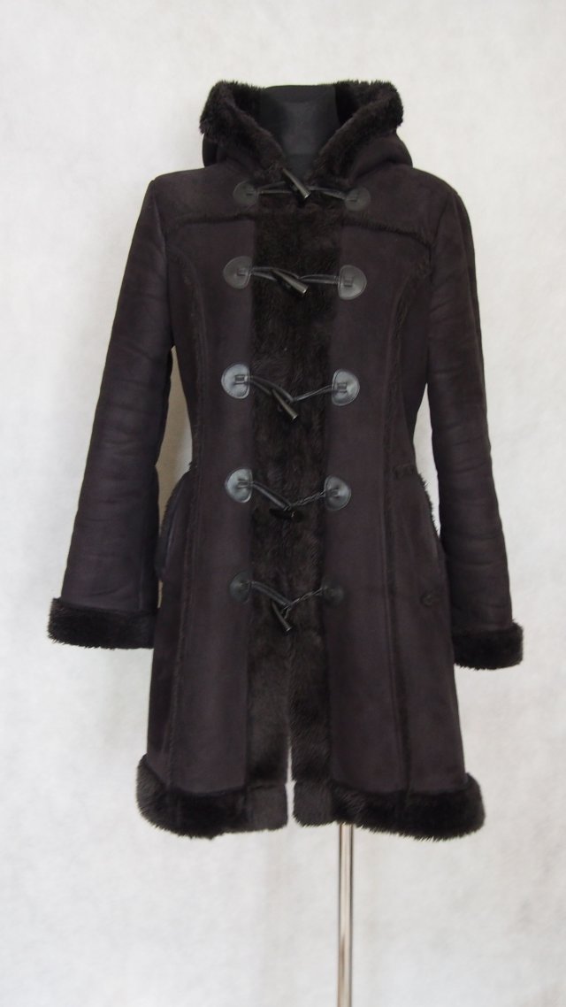 Przecudowny kożuszek z dużym kapturem. Zapinany na haftki i duże guziczki. Dwie kieszenie, od spodu sztuczne futerko.