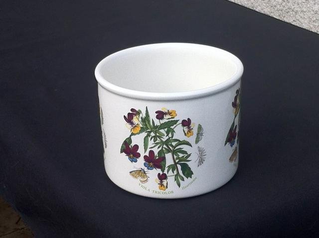 Duży porcelanowy Pojemnik sygnowany PORTMEIRION Made in England z rysunkami Susan Williams Ellis. Z kultowej serii BOTANIC GARDEN /Dishwasher proof; oven to table; freezer & microwave safe/. W pełni użytkowy i przepięknie zdobiony. Mocny,szlachetny. Na cieplej bieli porcelany Viola Tricolor i charakterystyczny motylek... w przyjemnych dla oka żywych barwach. Całość na błyszcząco szkliwiona.